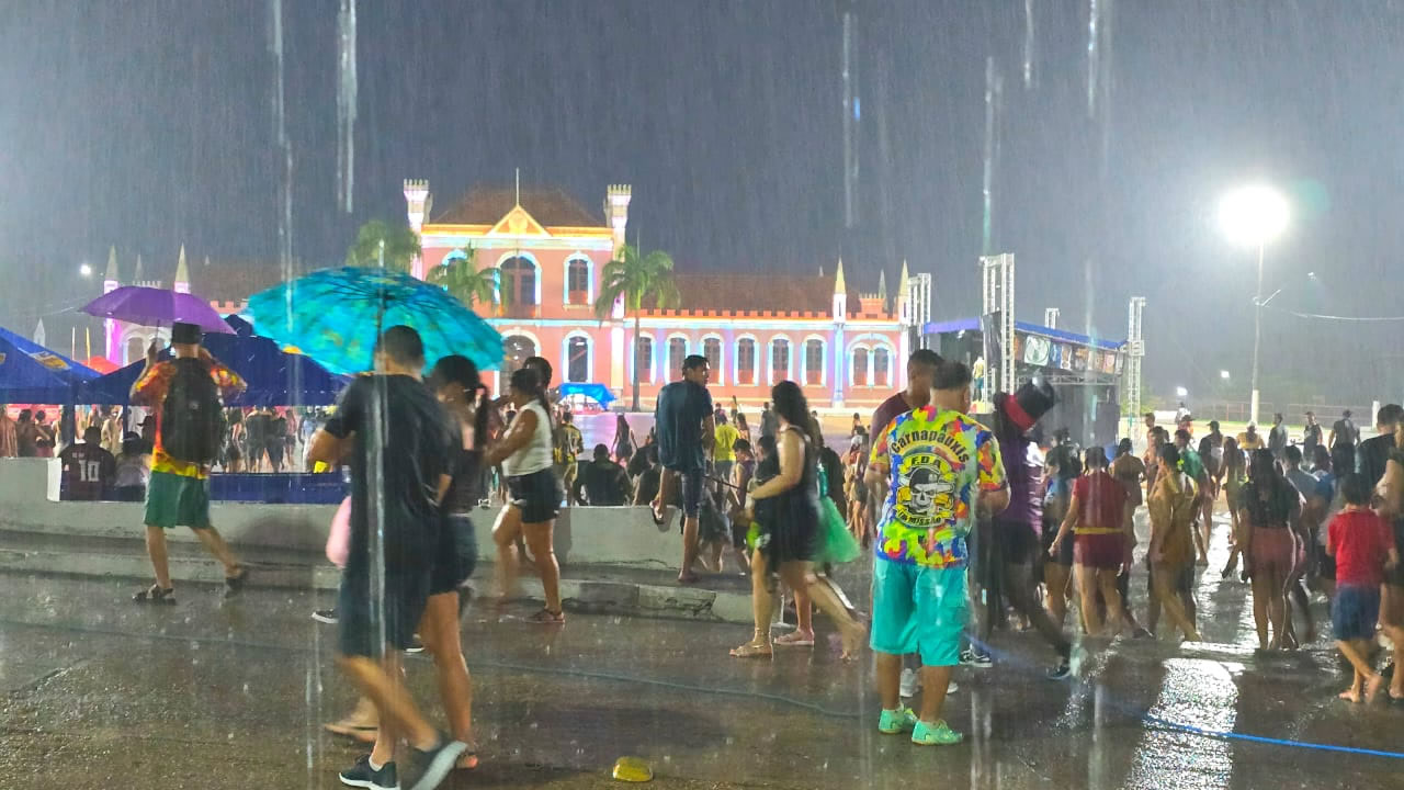 No entanto, o brilho da festa foi parcialmente afetado pela forte chuva que caiu sobre a cidade. O temporal começou na metade do percurso, surpreendendo foliões e organizadores. A intensidade da chuva dificultou o deslocamento dos blocos e prejudicou, de certa forma, a chegada à Praça da Cultura, onde parte do público já aguardava para o encerramento do arrastão.