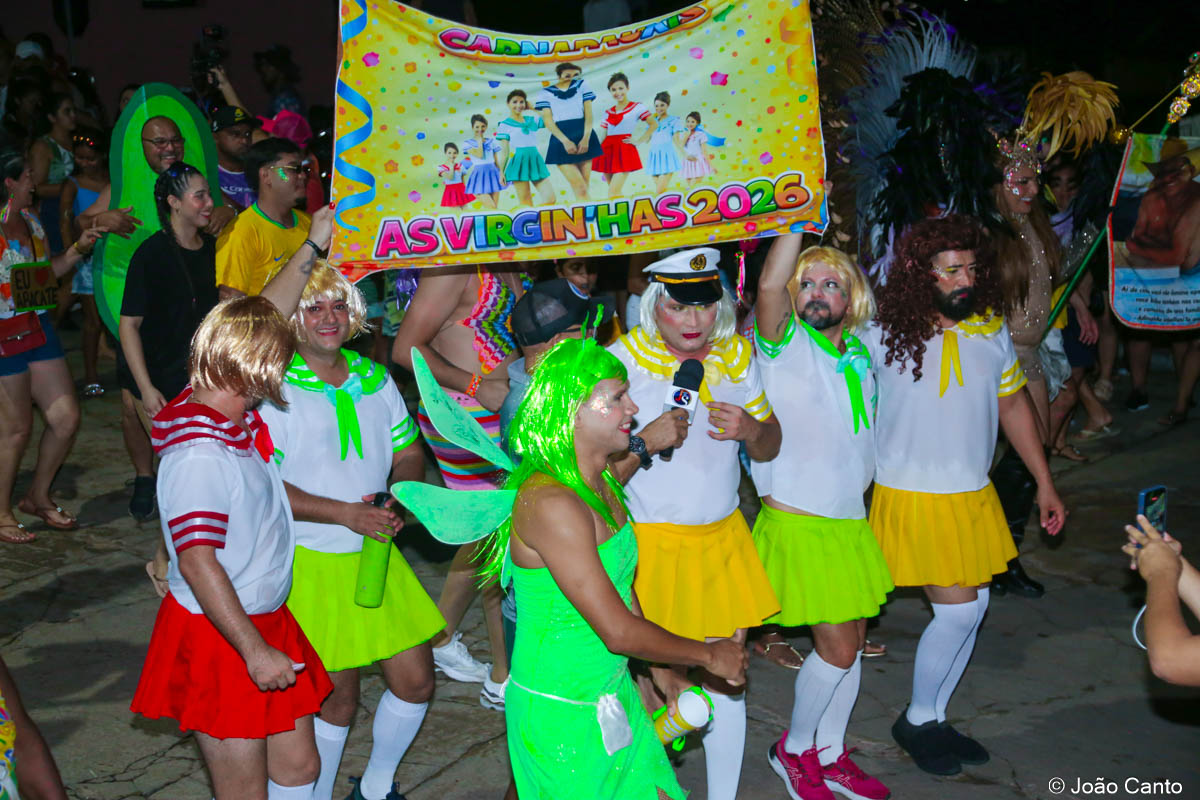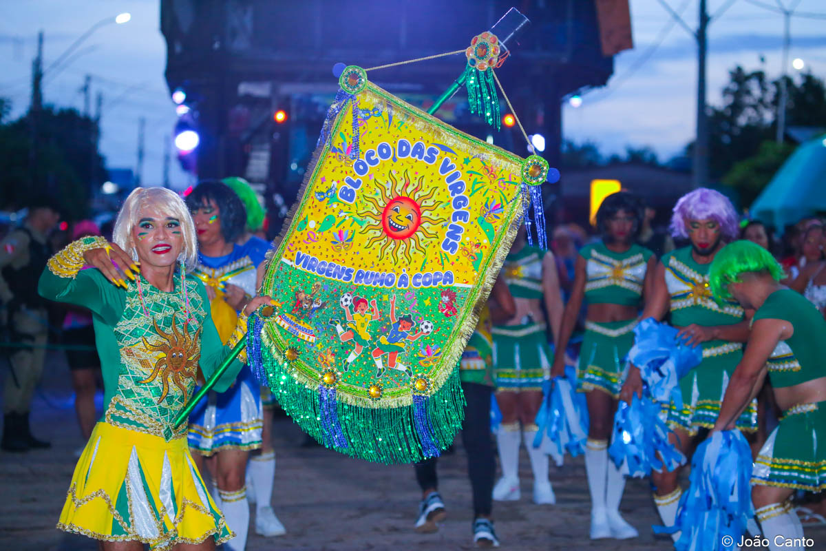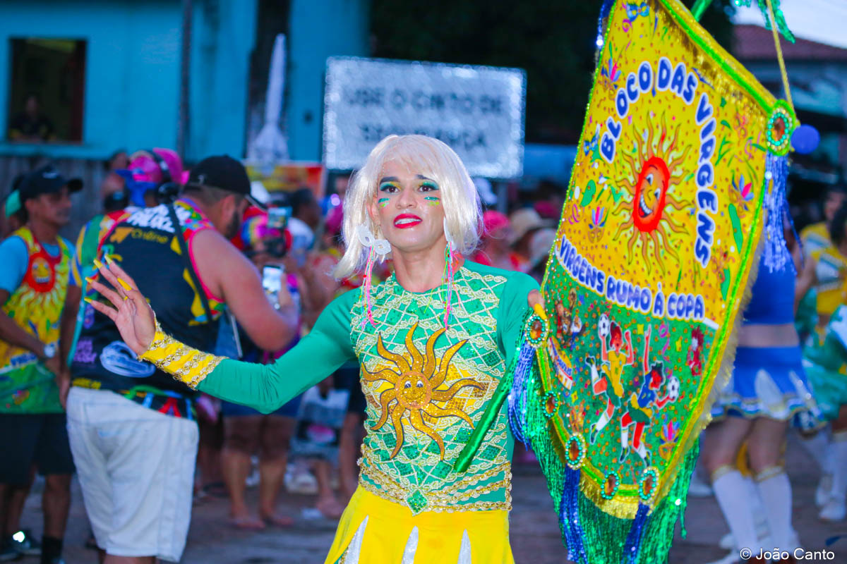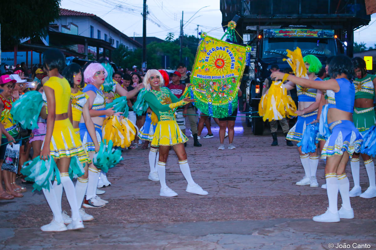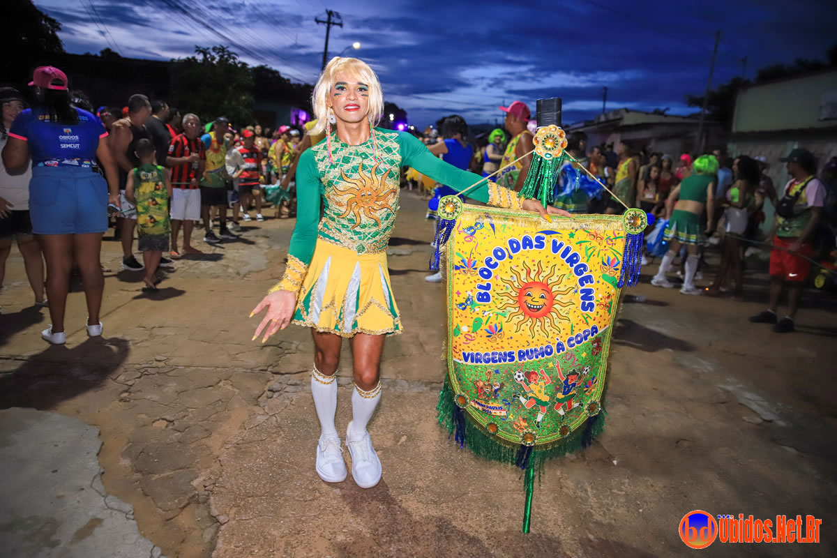 Tradicionalmente conhecido pela inversão de papéis — com homens vestidos de mulher e mulheres caracterizadas como homens —, o Bloco das Virgens transformou o percurso em um verdadeiro espetáculo de cores, música e diversão. Com o tema “As Virgens na Copa do Mundo”, a comissão de frente contou com 12 virgens, além da presença marcante do ícone do carnaval obidense, o Mascarado Fobó, e das personagens que simbolizam a essência do bloco.