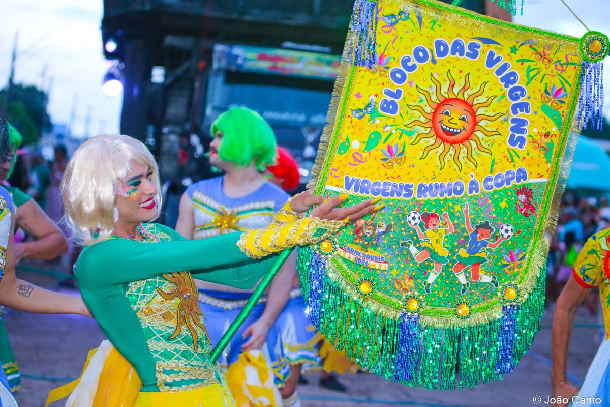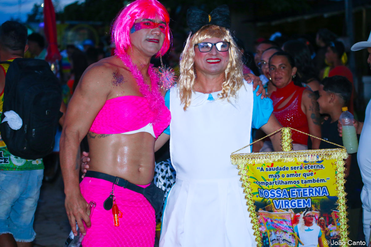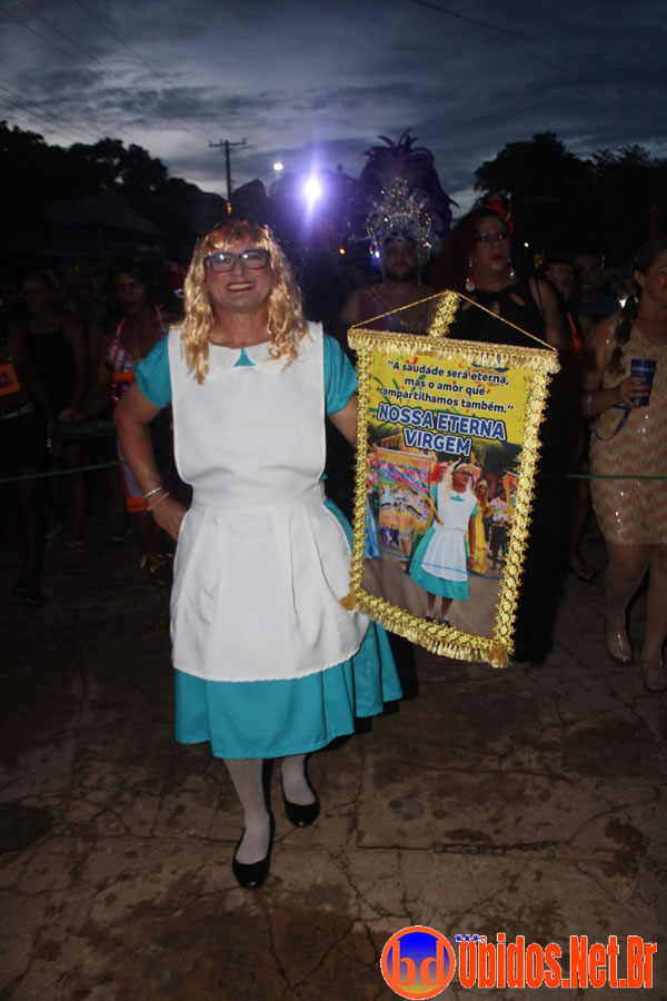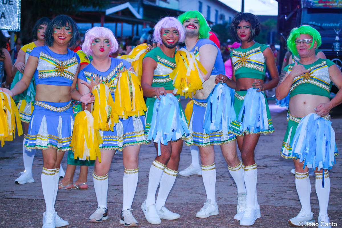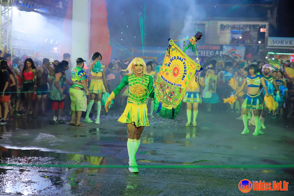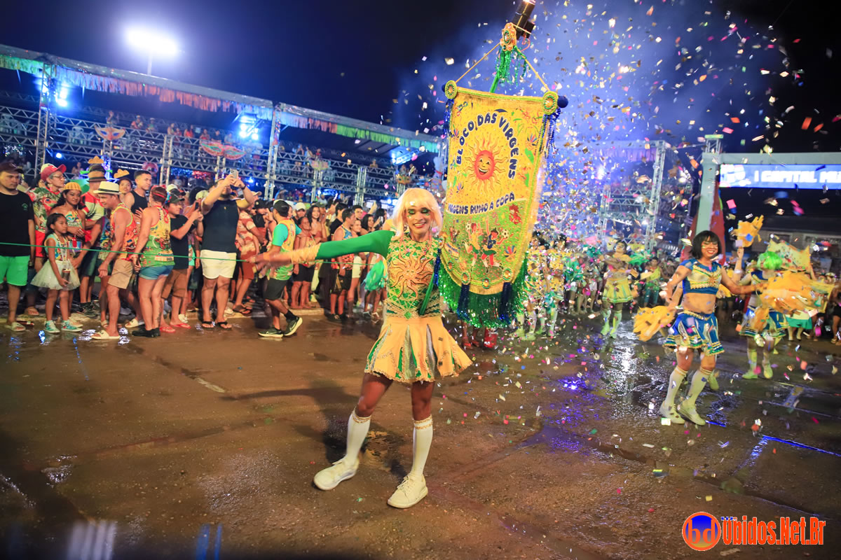 Tradicionalmente conhecido pela inversão de papéis — com homens vestidos de mulher e mulheres caracterizadas como homens —, o Bloco das Virgens transformou o percurso em um verdadeiro espetáculo de cores, música e diversão. Com o tema “As Virgens na Copa do Mundo”, a comissão de frente contou com 12 virgens, além da presença marcante do ícone do carnaval obidense, o Mascarado Fobó, e das personagens que simbolizam a essência do bloco.
