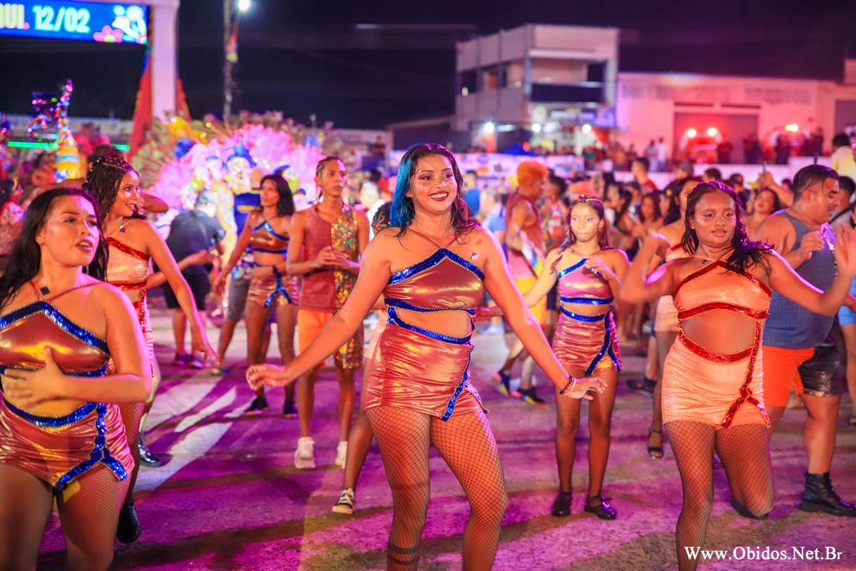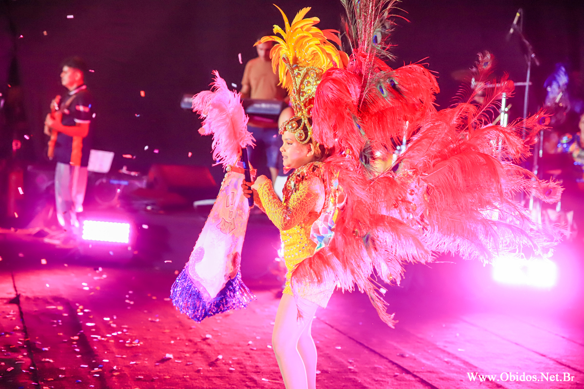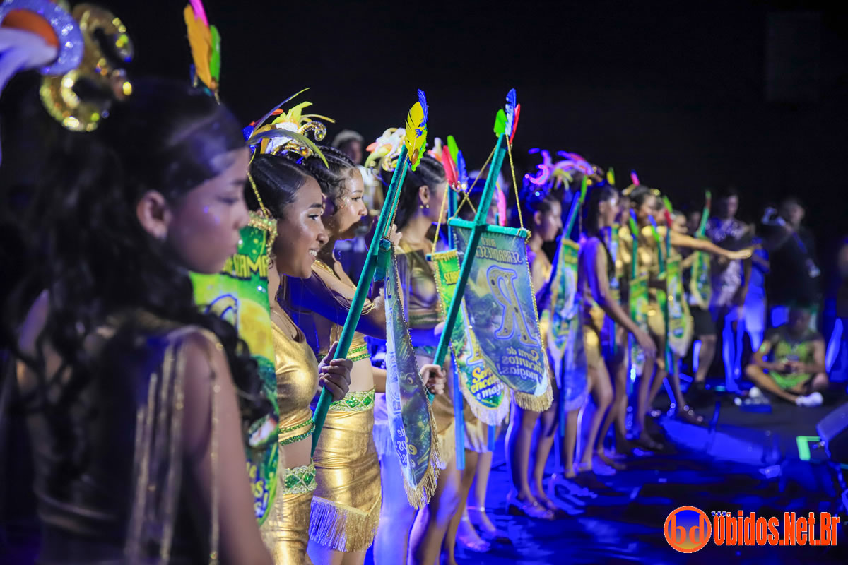 A comissão de frente apresentou o tema “Riquezas Naturais do Nosso Tesouro Maior”, levando à avenida 13 meninas com cetros, simbolizando a proteção e o valor das riquezas naturais da Serra da Escama, elementos que constroem a identidade do povo obidense.