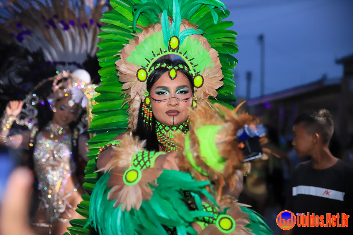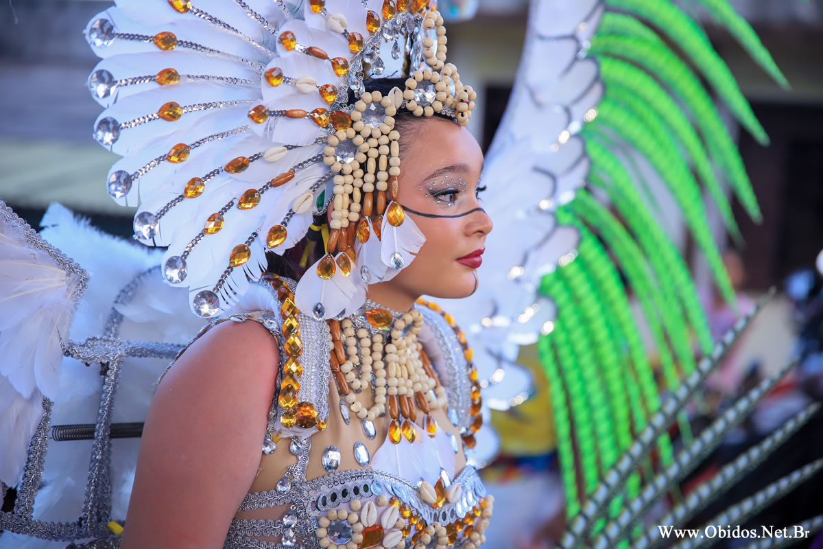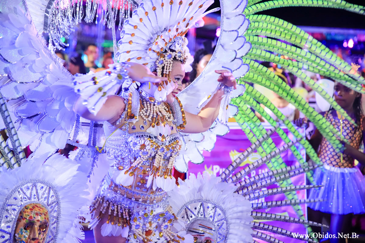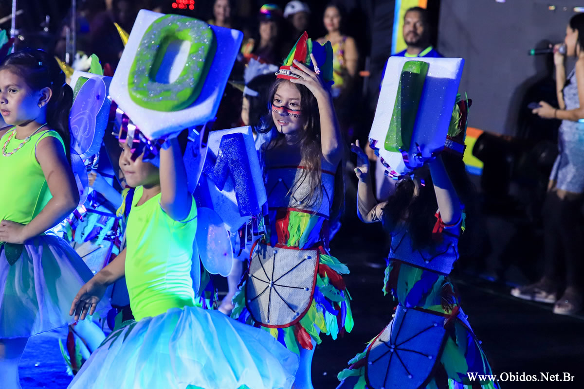 A comissão de frente apresentou o tema “Riquezas Naturais do Nosso Tesouro Maior”, levando à avenida 13 meninas com cetros, simbolizando a proteção e o valor das riquezas naturais da Serra da Escama, elementos que constroem a identidade do povo obidense.