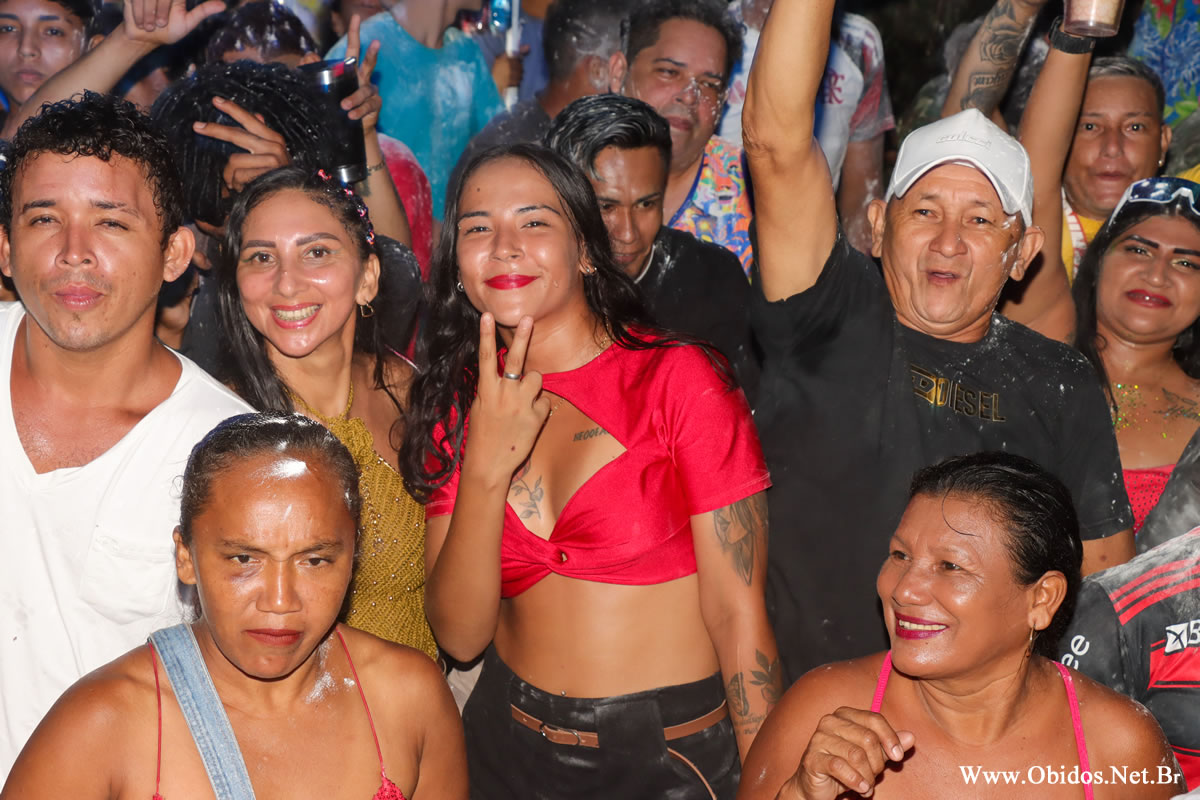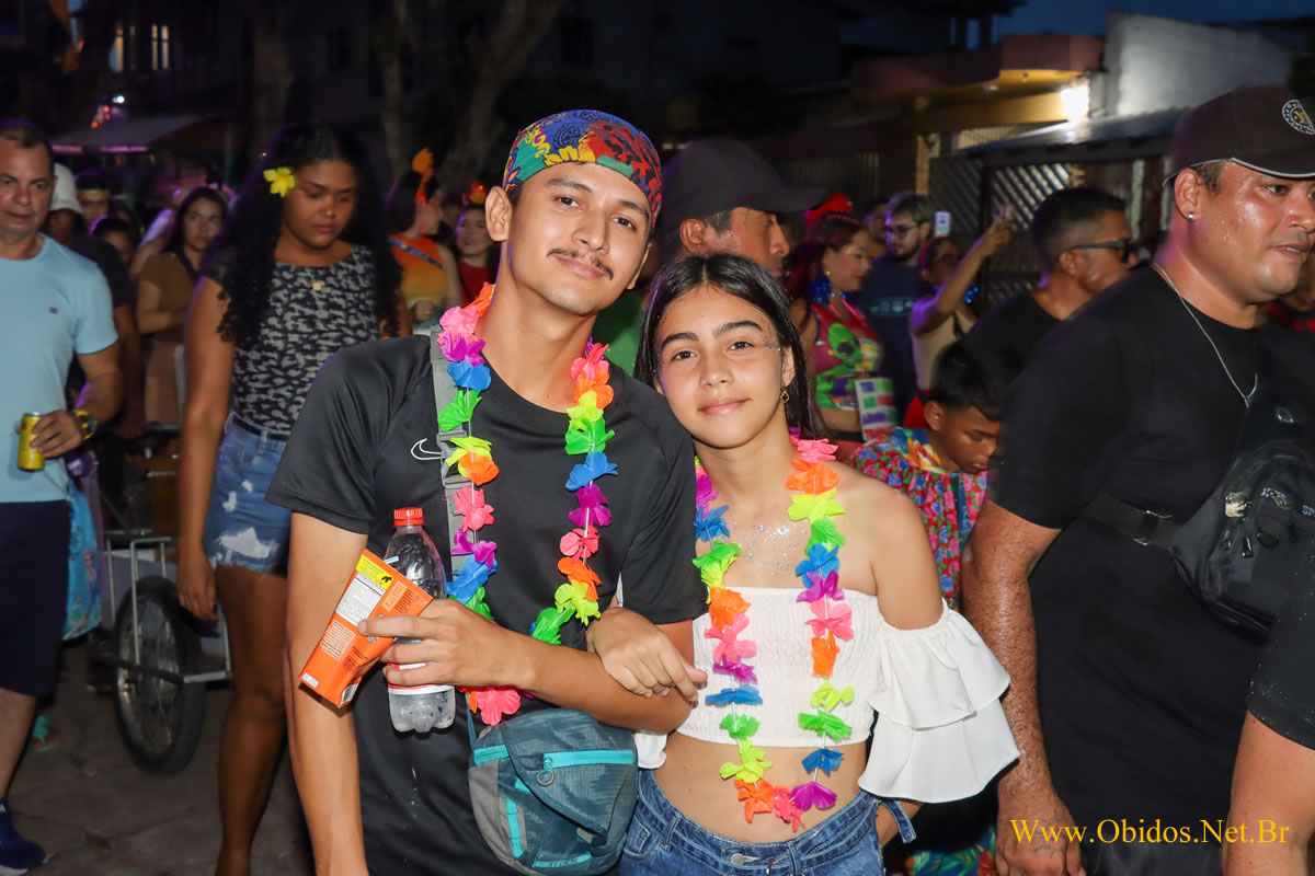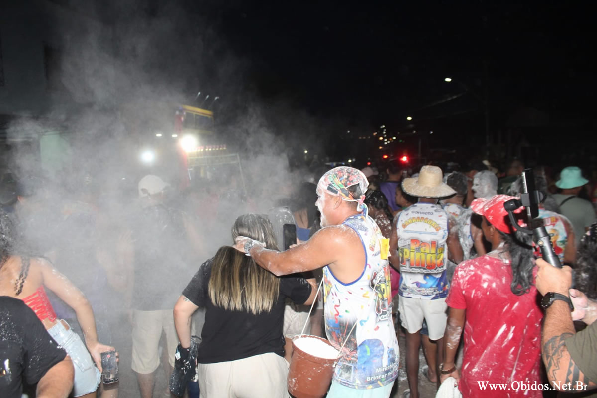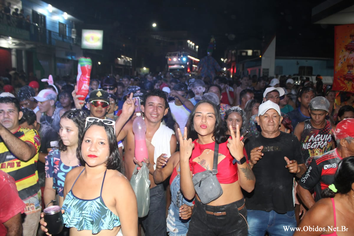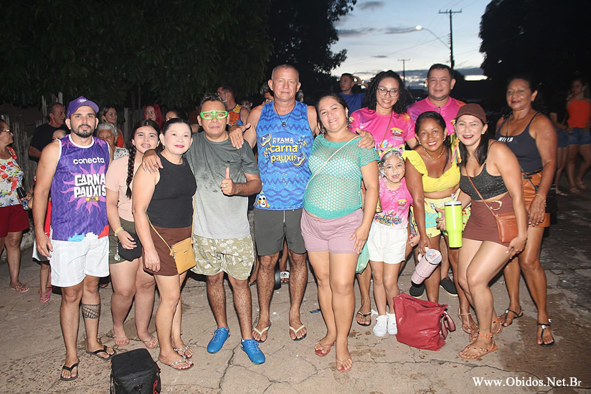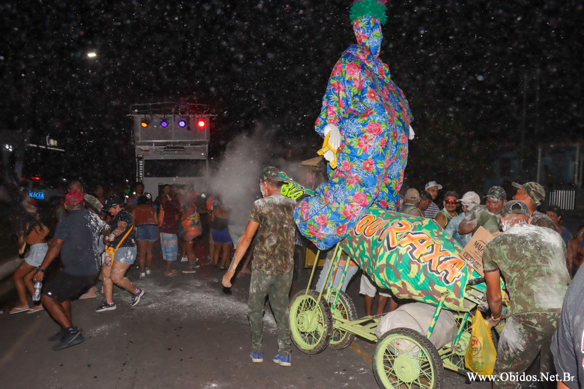 Na tradicional subida da Ladeira do Mercado, toda ornamentada para a ocasião, a chuva se intensificou. Ainda assim, os foliões encararam a ladeira com animação e alegria, sendo saudados por uma salva de fogos que iluminou o céu de Óbidos, em homenagem a um dos blocos mais populares e divertidos do Carnapauxis.