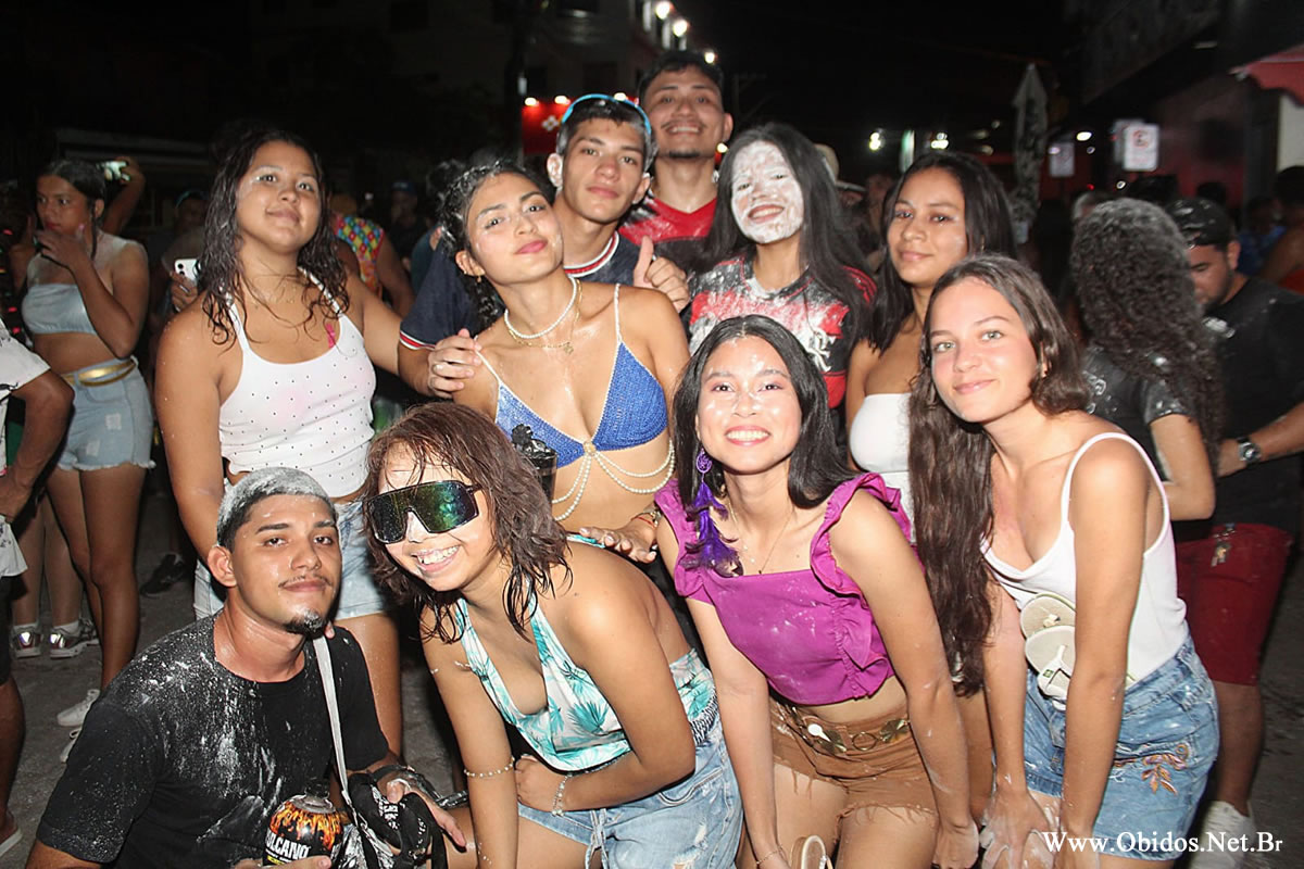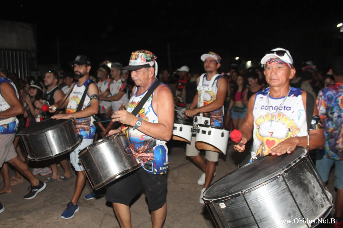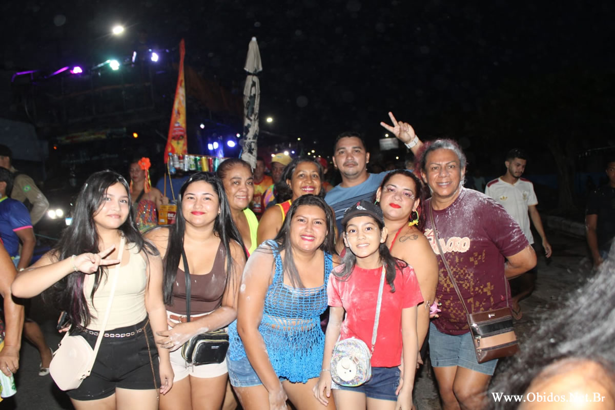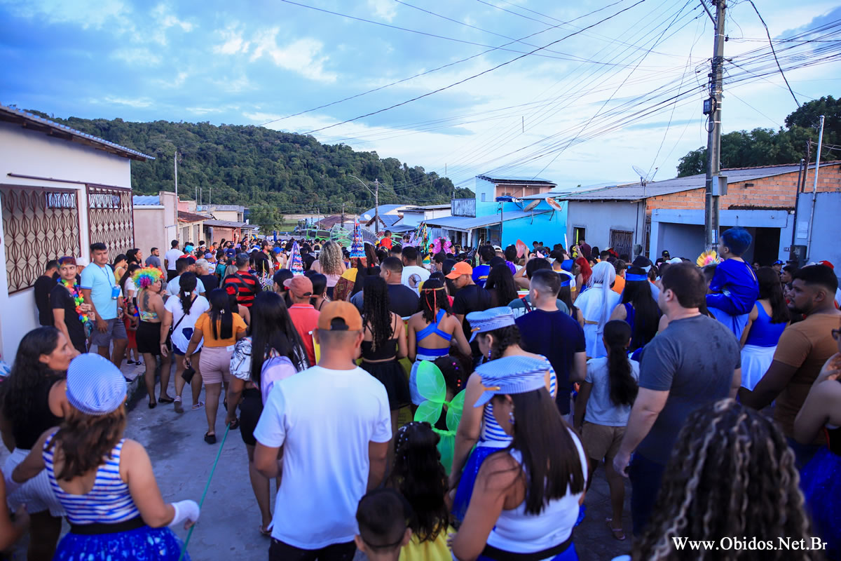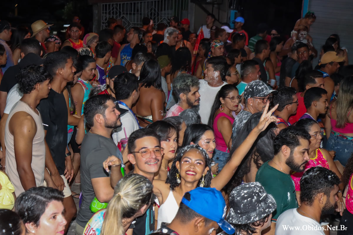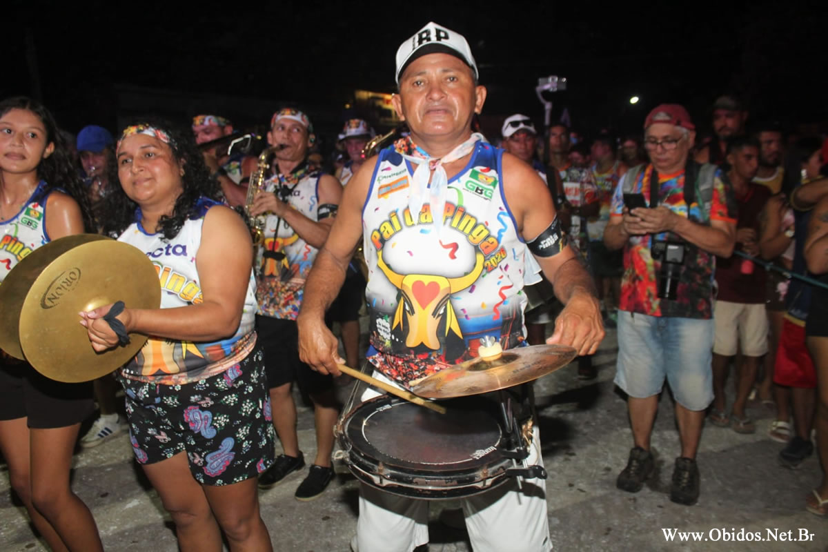 Na tradicional subida da Ladeira do Mercado, toda ornamentada para a ocasião, a chuva se intensificou. Ainda assim, os foliões encararam a ladeira com animação e alegria, sendo saudados por uma salva de fogos que iluminou o céu de Óbidos, em homenagem a um dos blocos mais populares e divertidos do Carnapauxis.