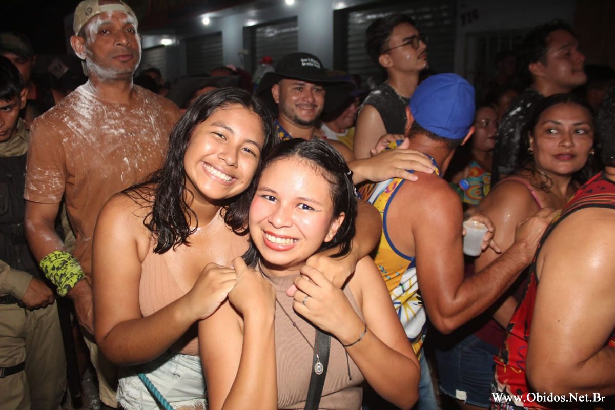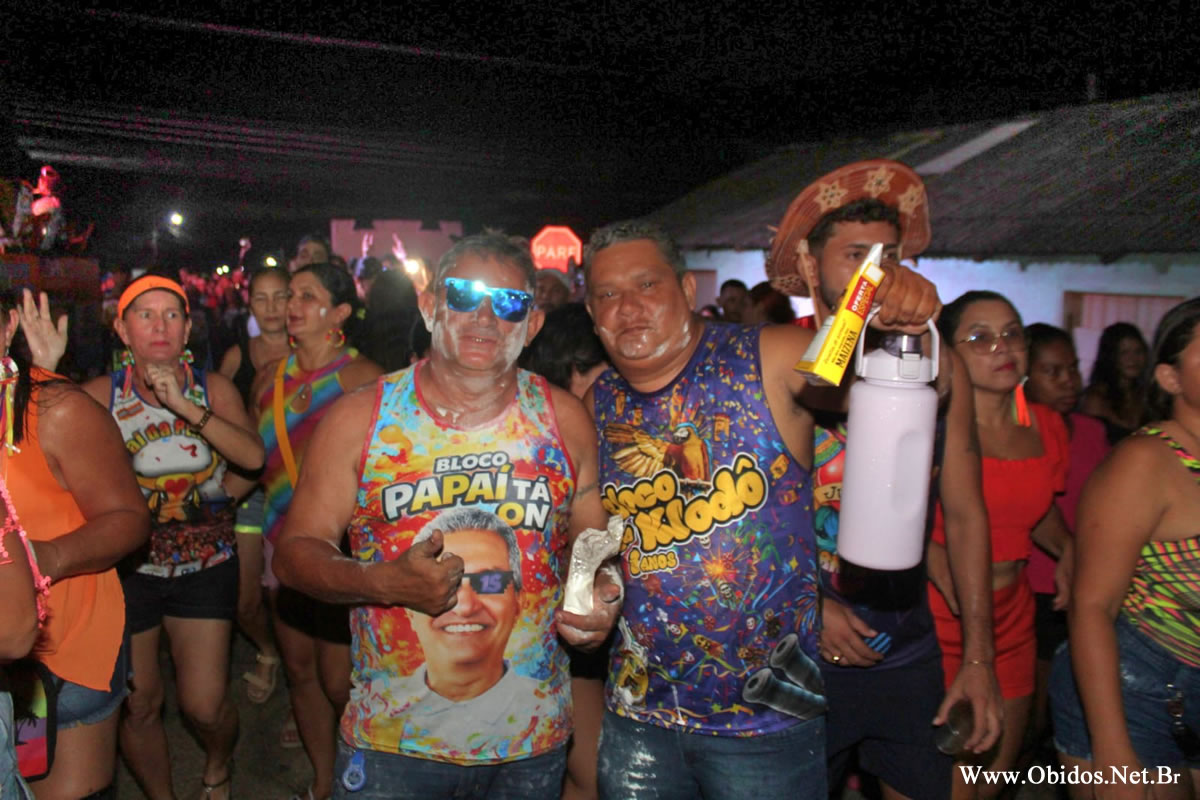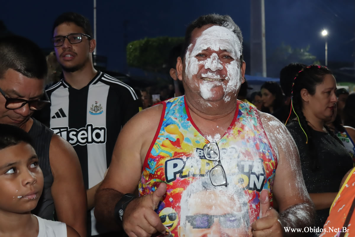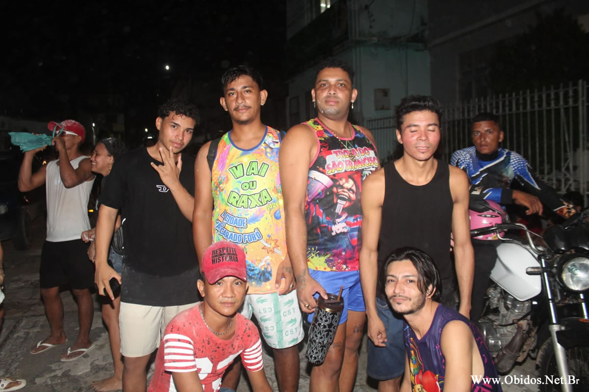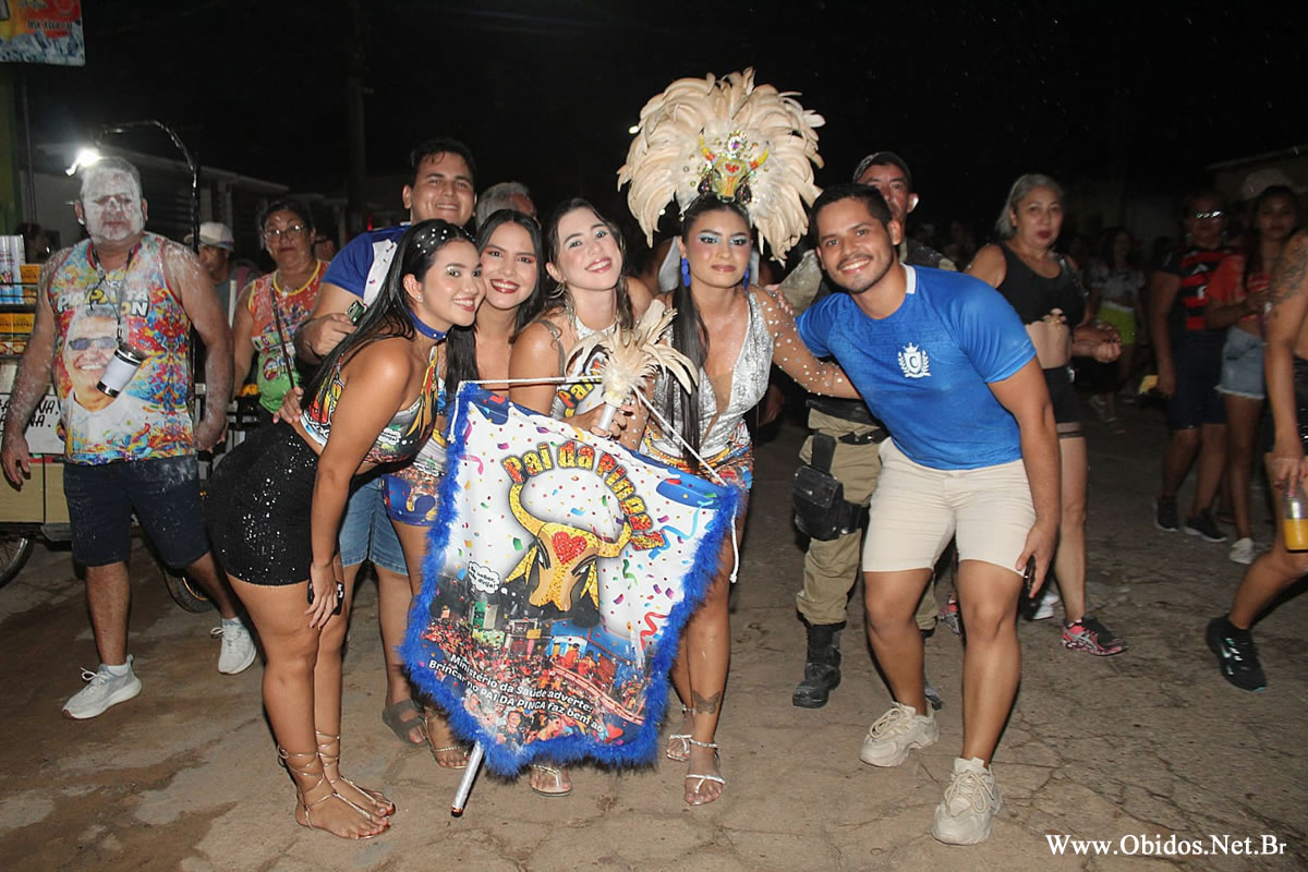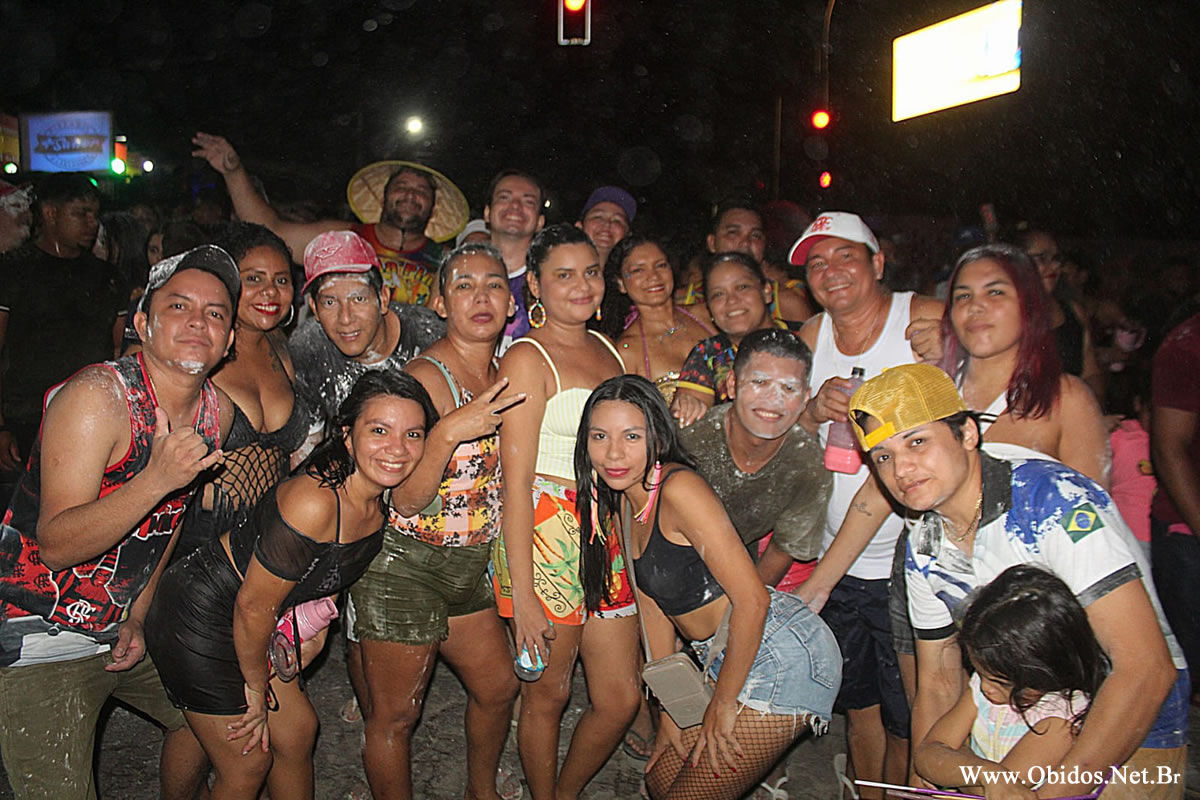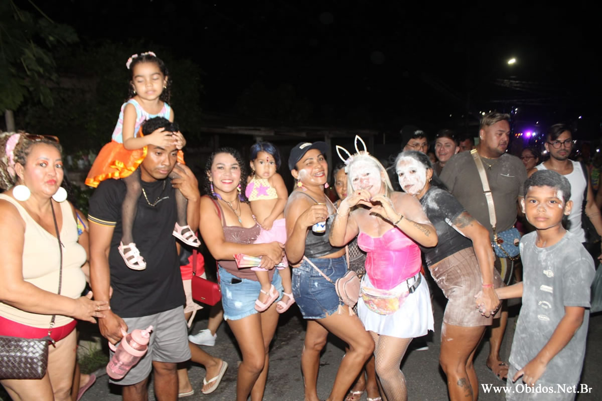 Na tradicional subida da Ladeira do Mercado, toda ornamentada para a ocasião, a chuva se intensificou. Ainda assim, os foliões encararam a ladeira com animação e alegria, sendo saudados por uma salva de fogos que iluminou o céu de Óbidos, em homenagem a um dos blocos mais populares e divertidos do Carnapauxis.
