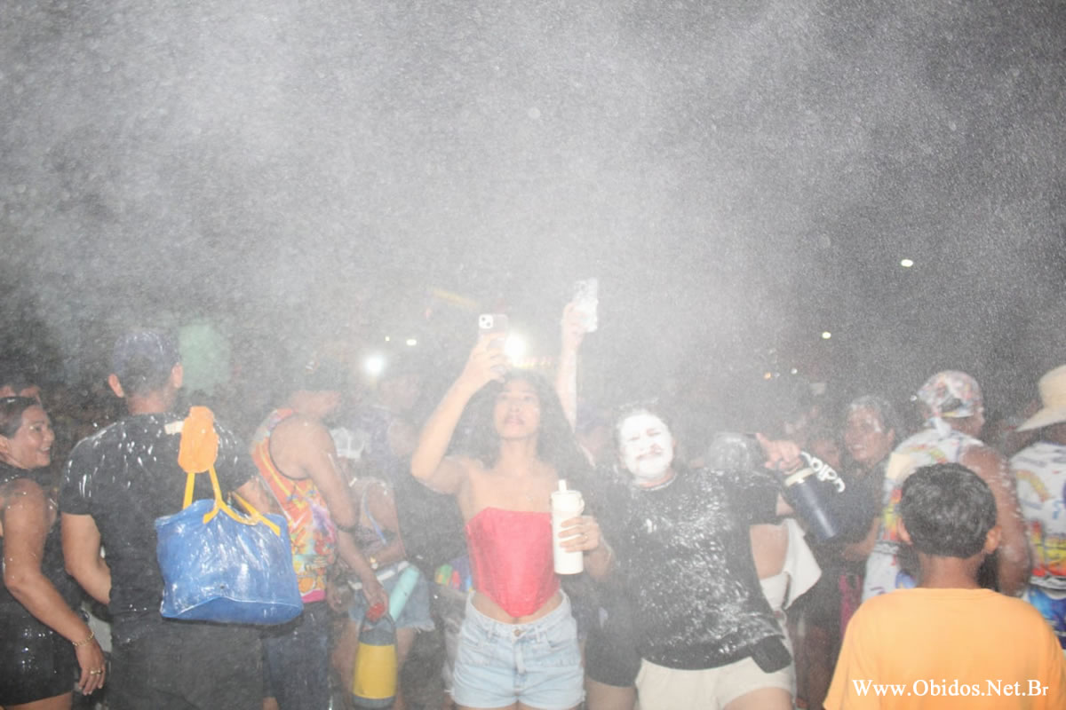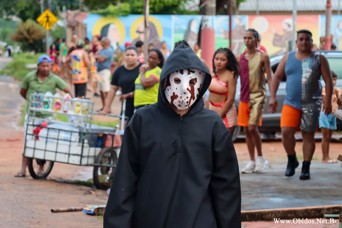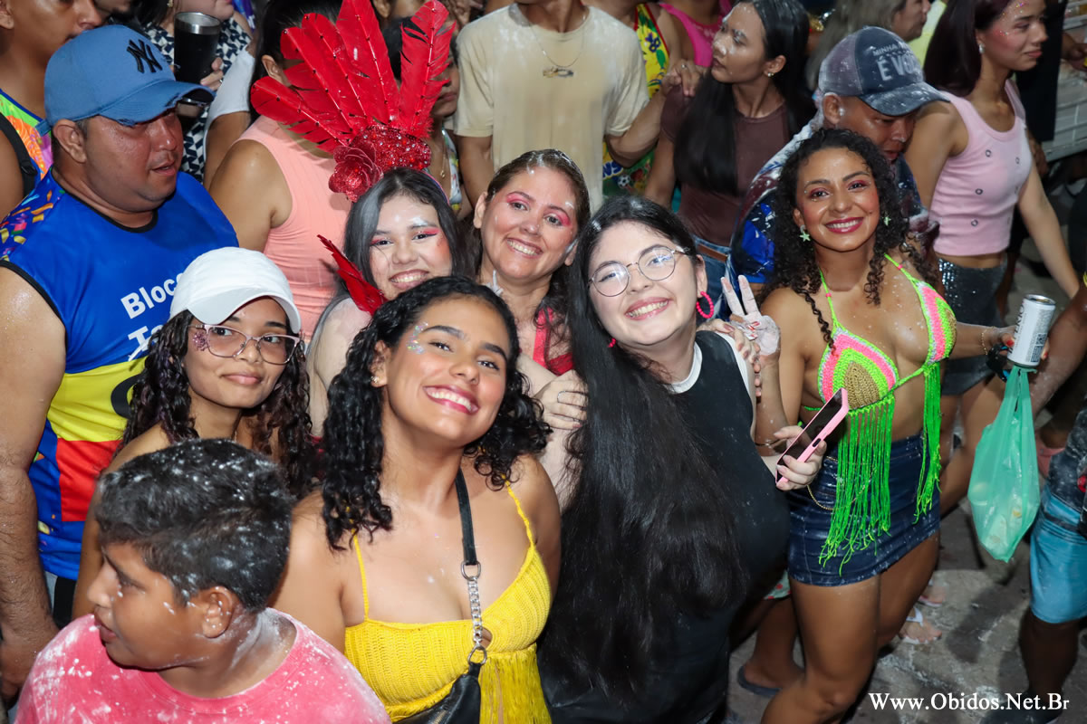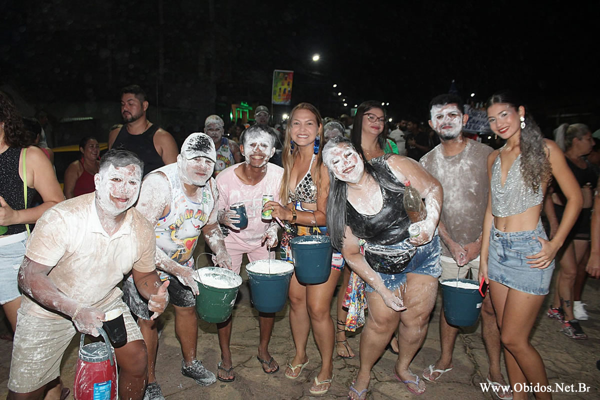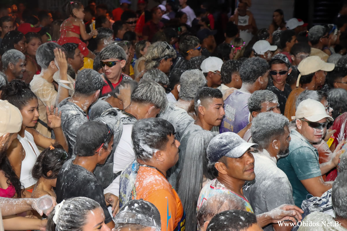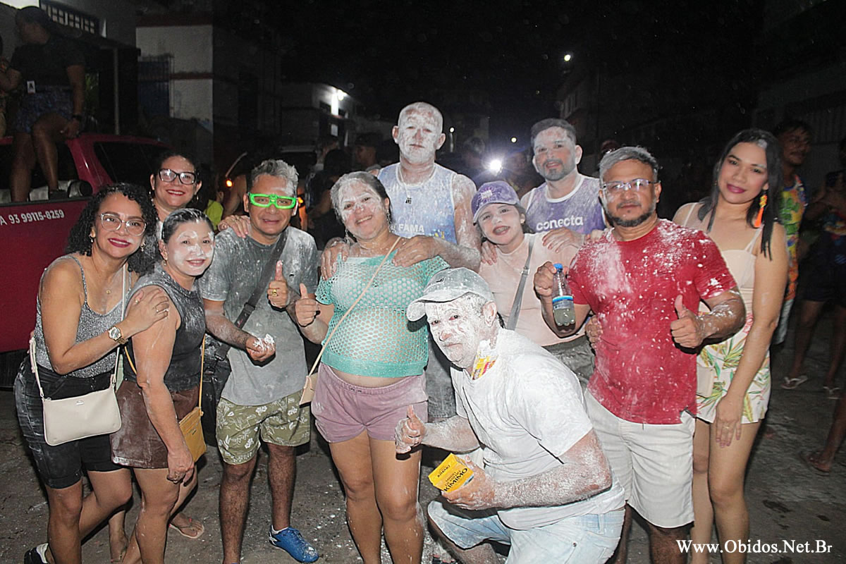 Na tradicional subida da Ladeira do Mercado, toda ornamentada para a ocasião, a chuva se intensificou. Ainda assim, os foliões encararam a ladeira com animação e alegria, sendo saudados por uma salva de fogos que iluminou o céu de Óbidos, em homenagem a um dos blocos mais populares e divertidos do Carnapauxis.