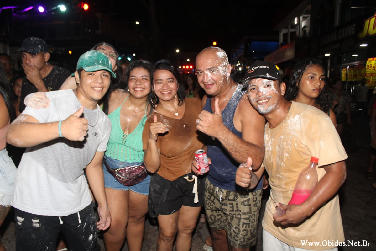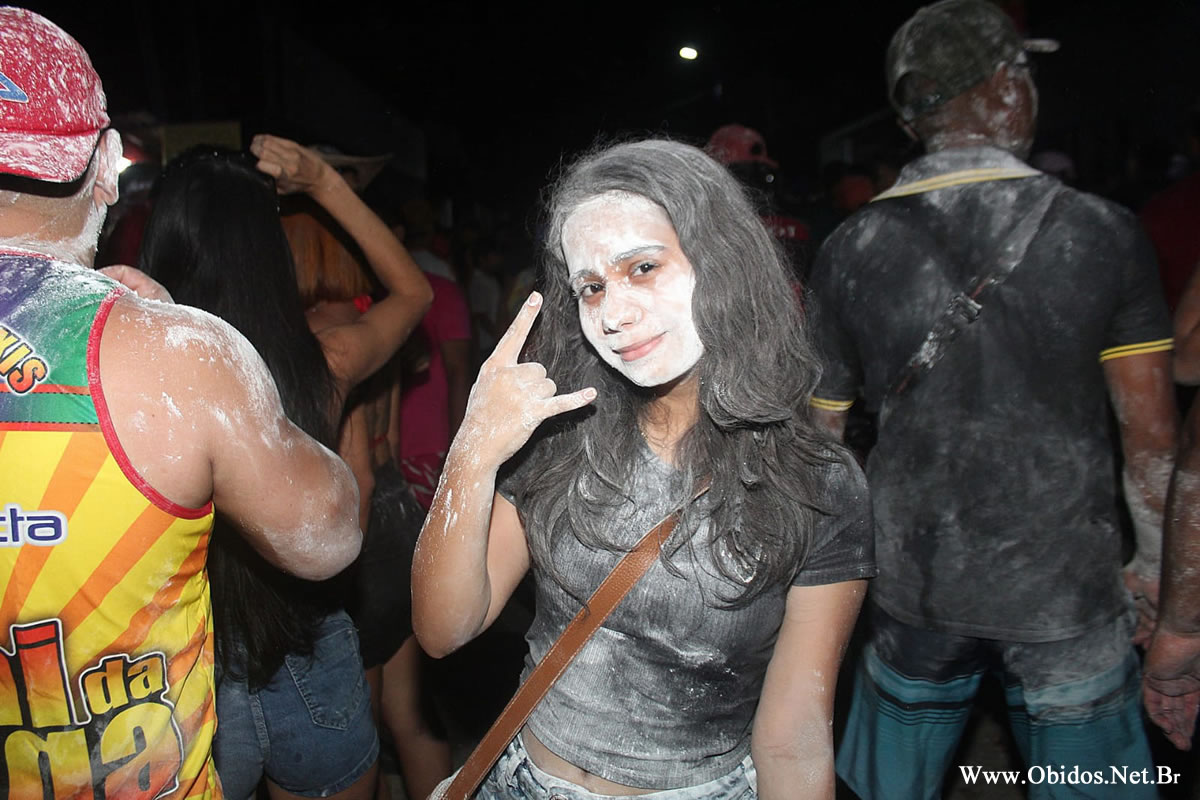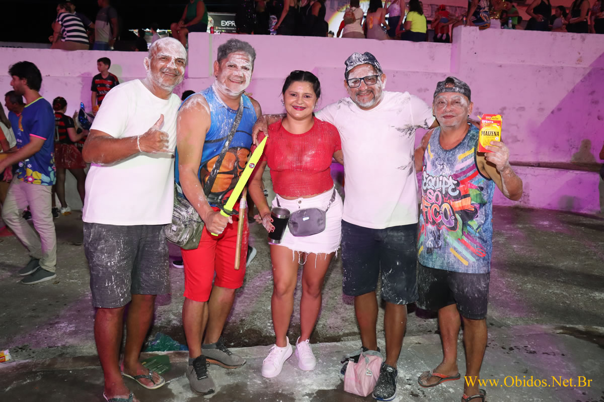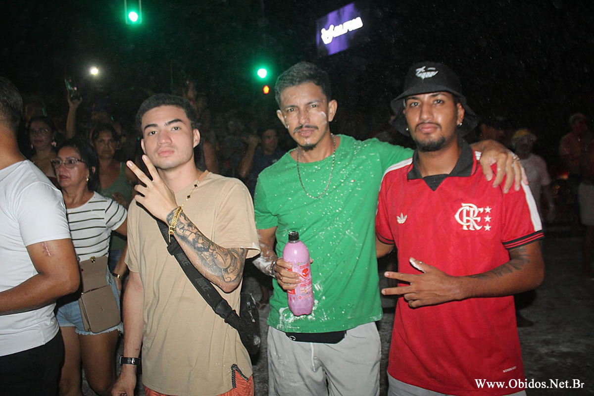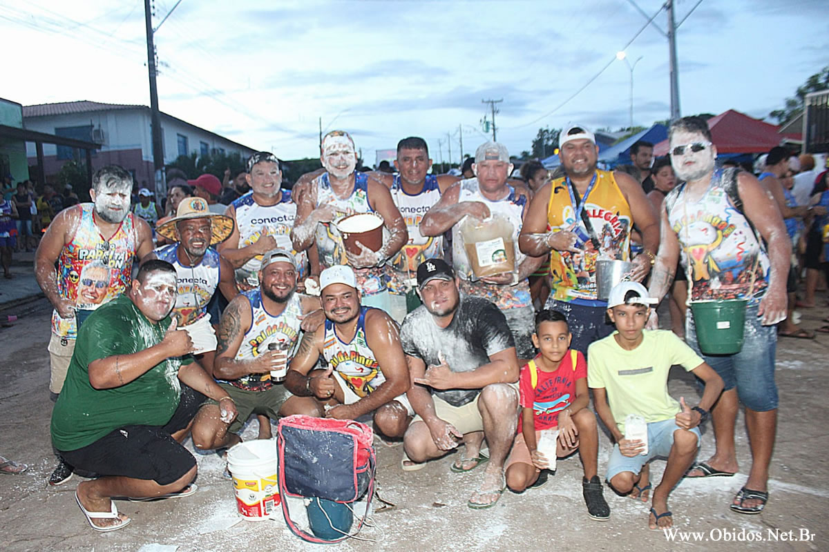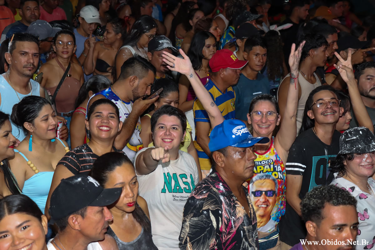 Na tradicional subida da Ladeira do Mercado, toda ornamentada para a ocasião, a chuva se intensificou. Ainda assim, os foliões encararam a ladeira com animação e alegria, sendo saudados por uma salva de fogos que iluminou o céu de Óbidos, em homenagem a um dos blocos mais populares e divertidos do Carnapauxis.