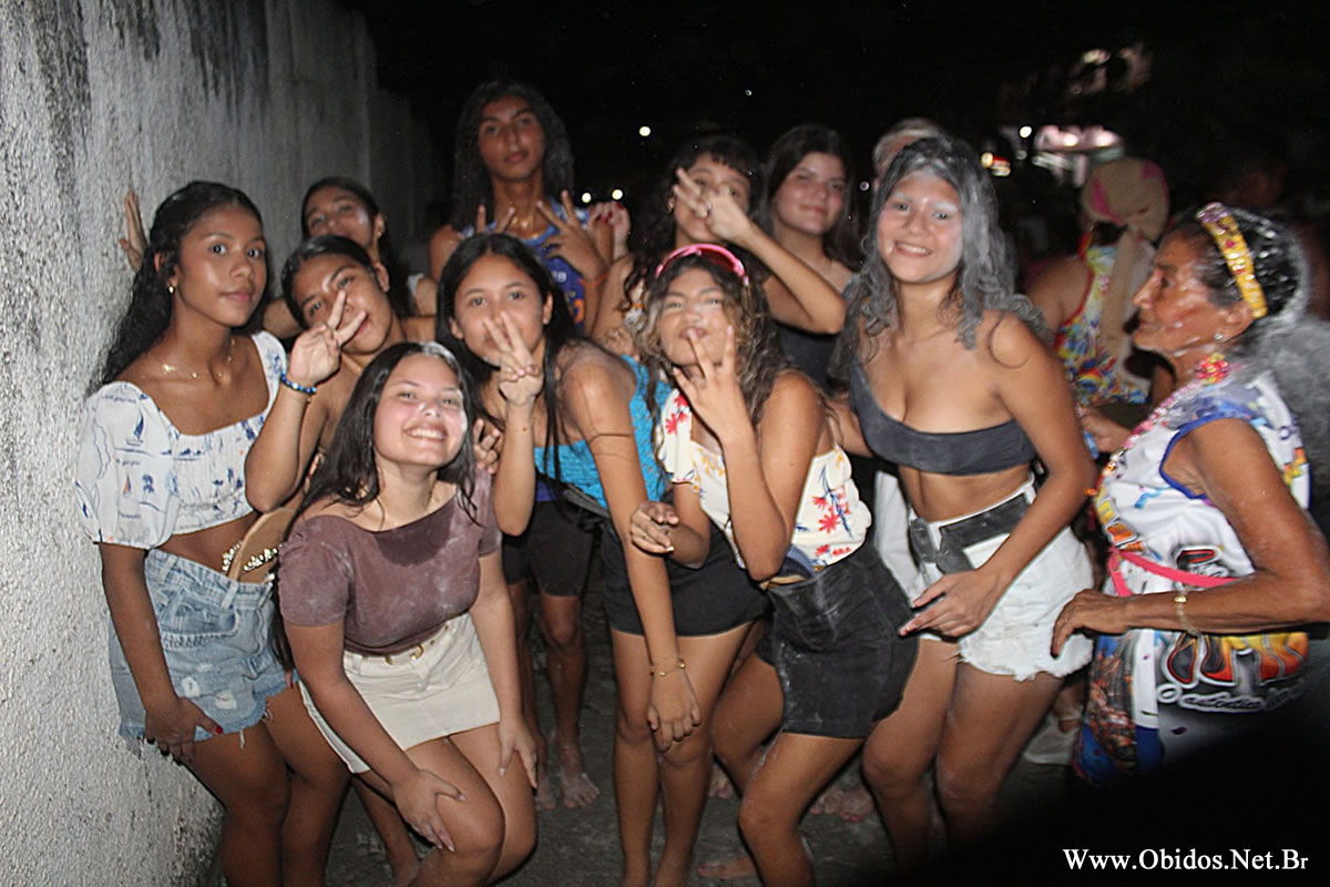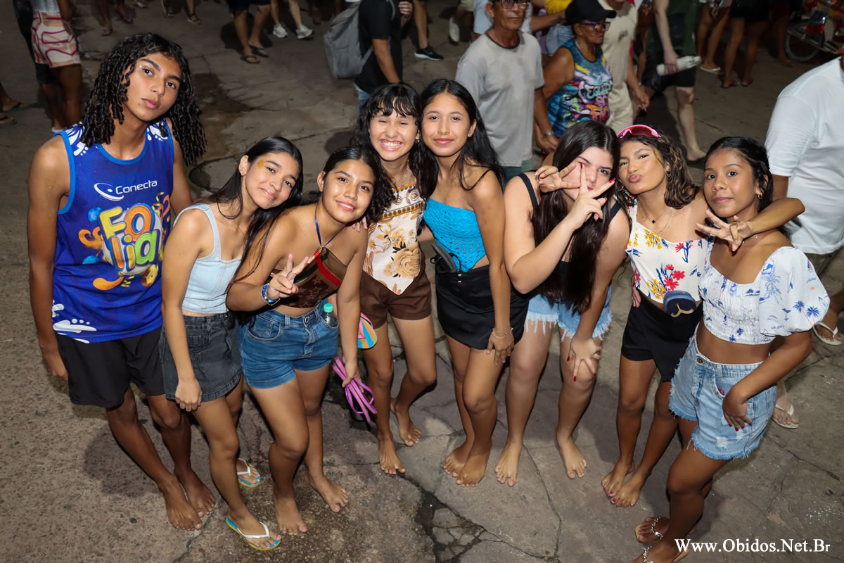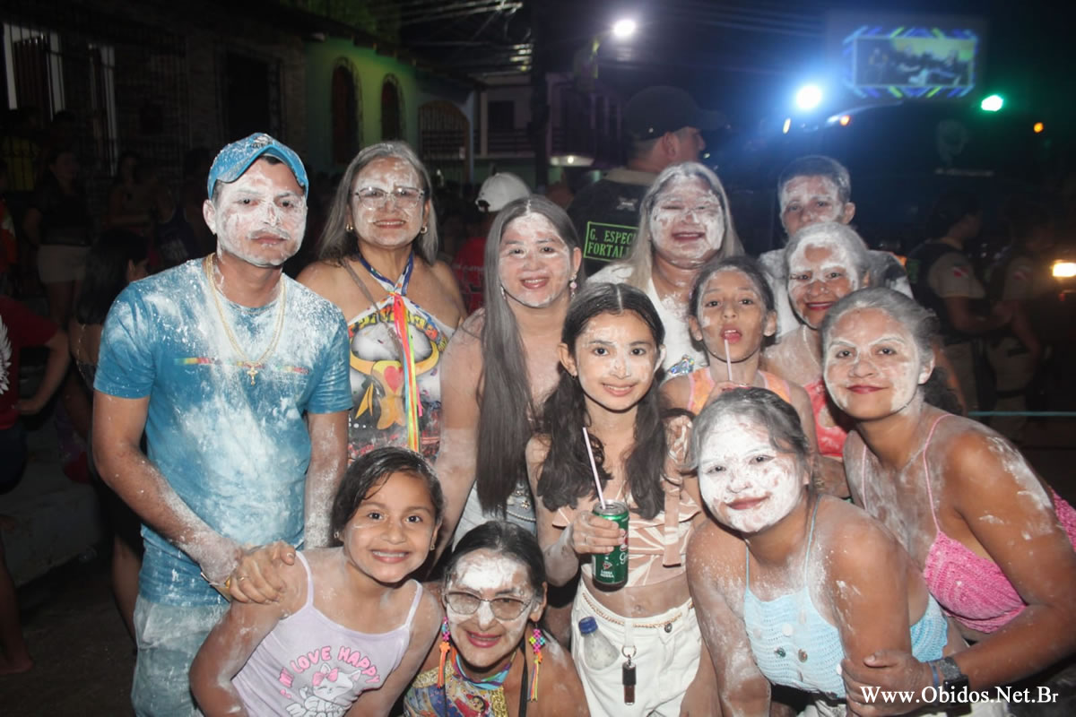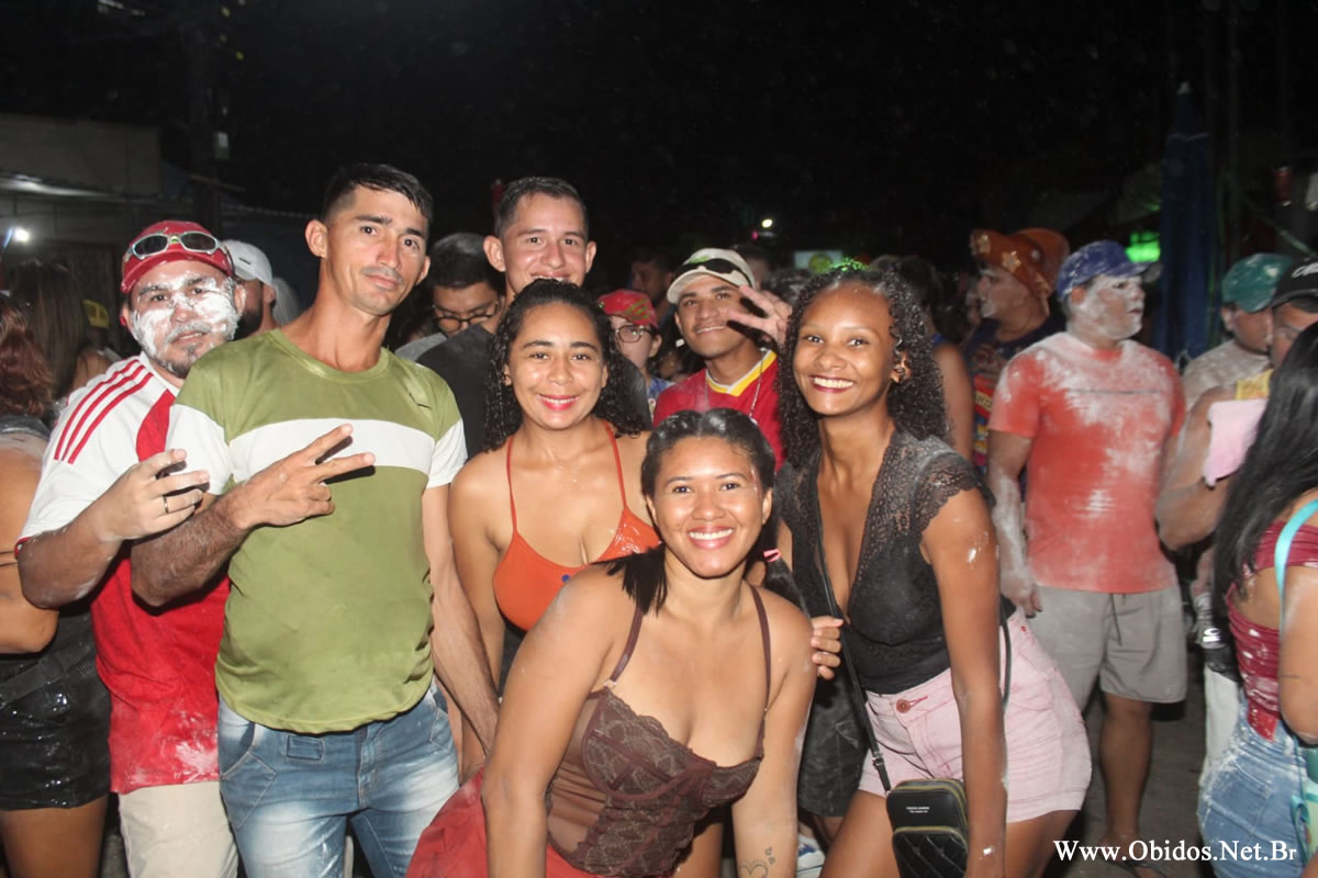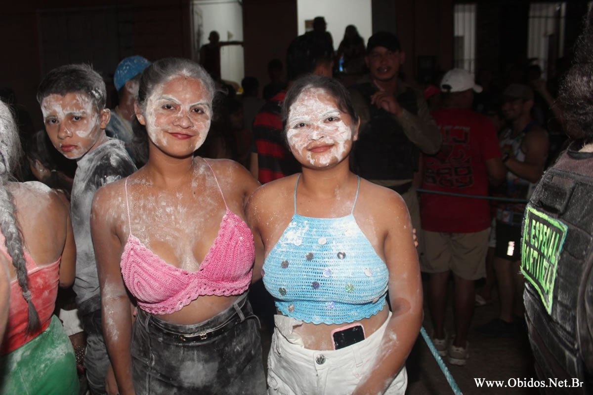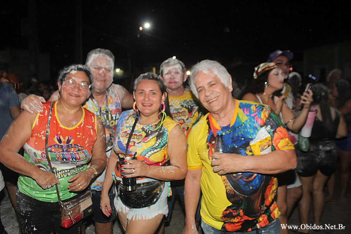 Na tradicional subida da Ladeira do Mercado, toda ornamentada para a ocasião, a chuva se intensificou. Ainda assim, os foliões encararam a ladeira com animação e alegria, sendo saudados por uma salva de fogos que iluminou o céu de Óbidos, em homenagem a um dos blocos mais populares e divertidos do Carnapauxis.
