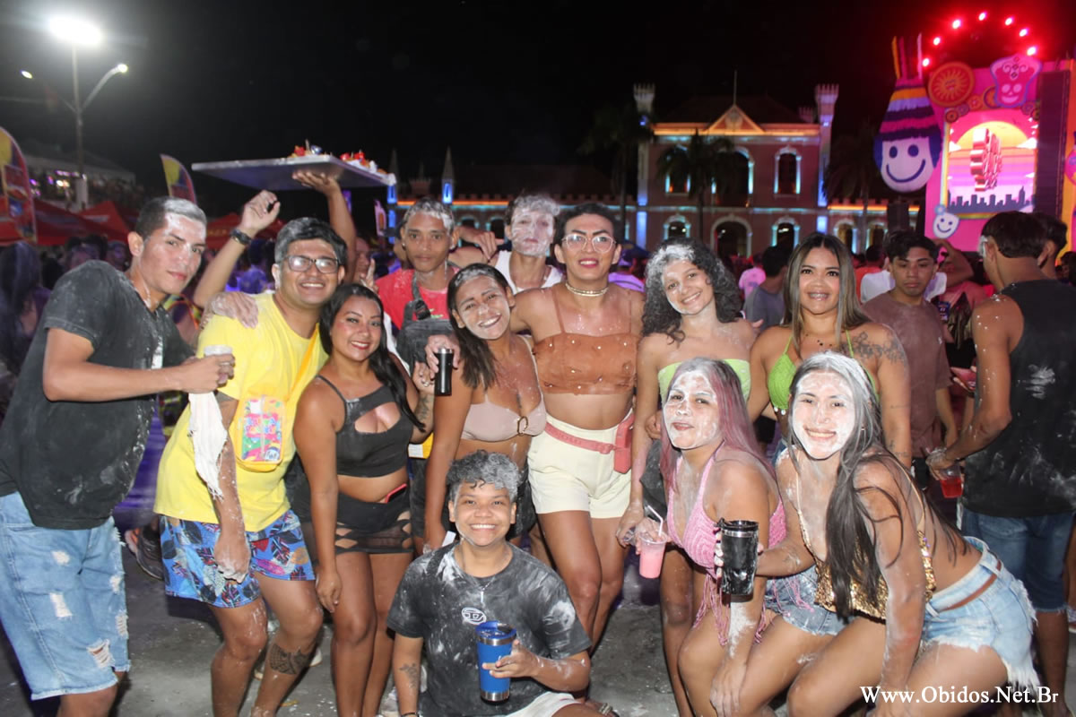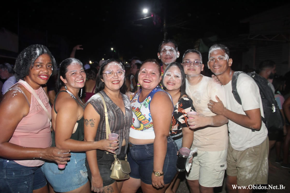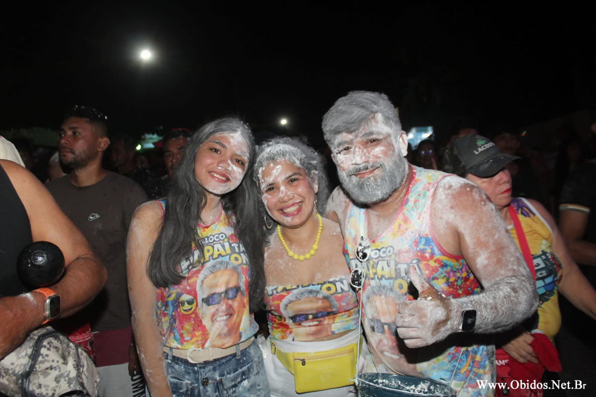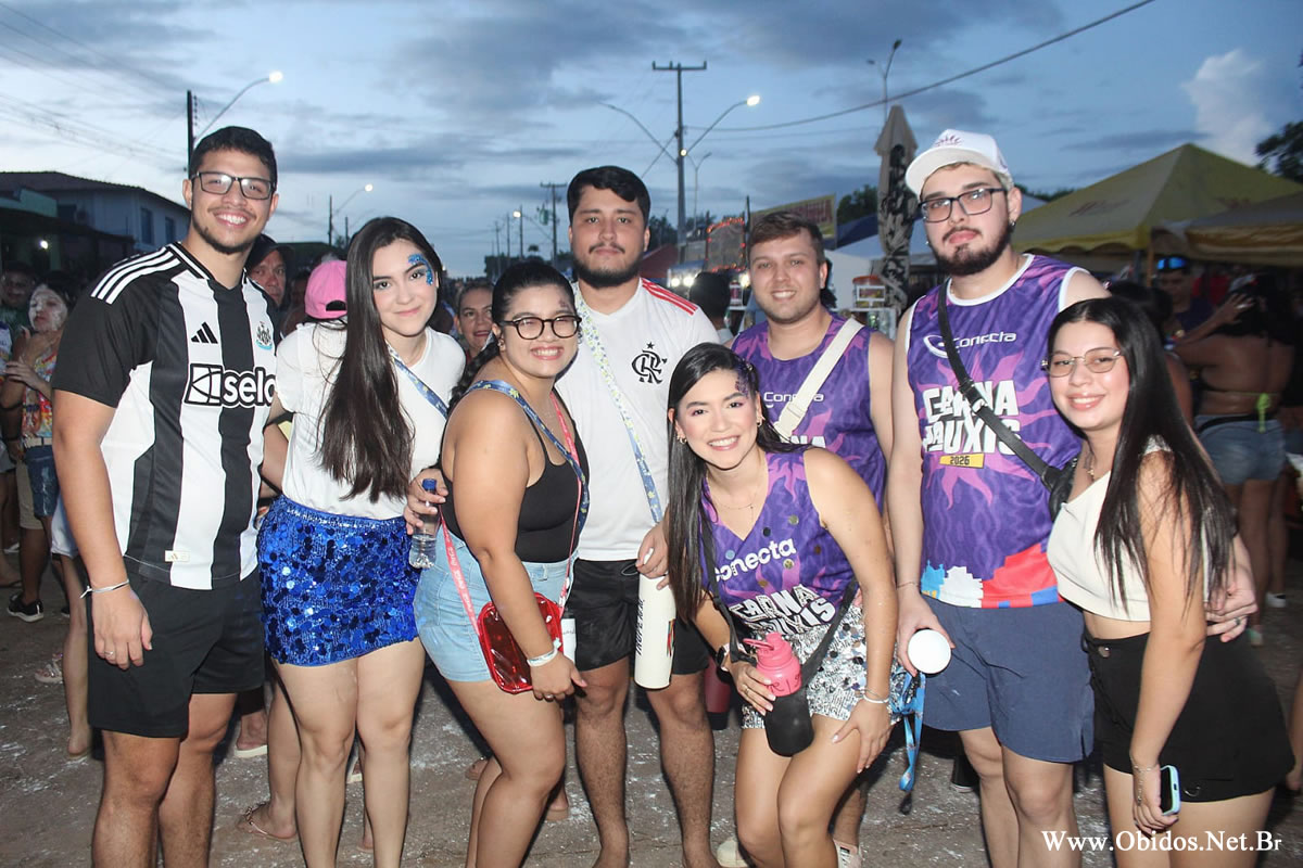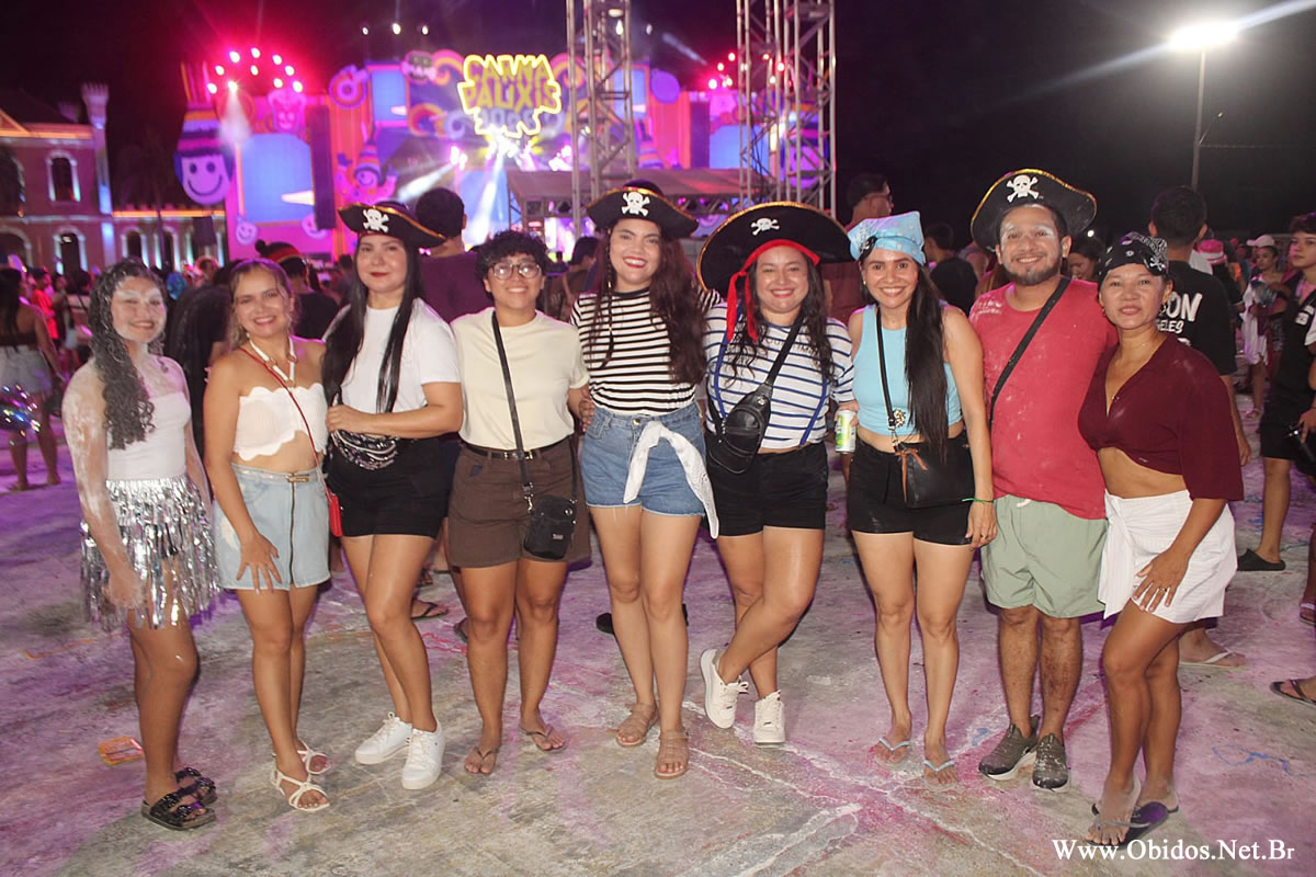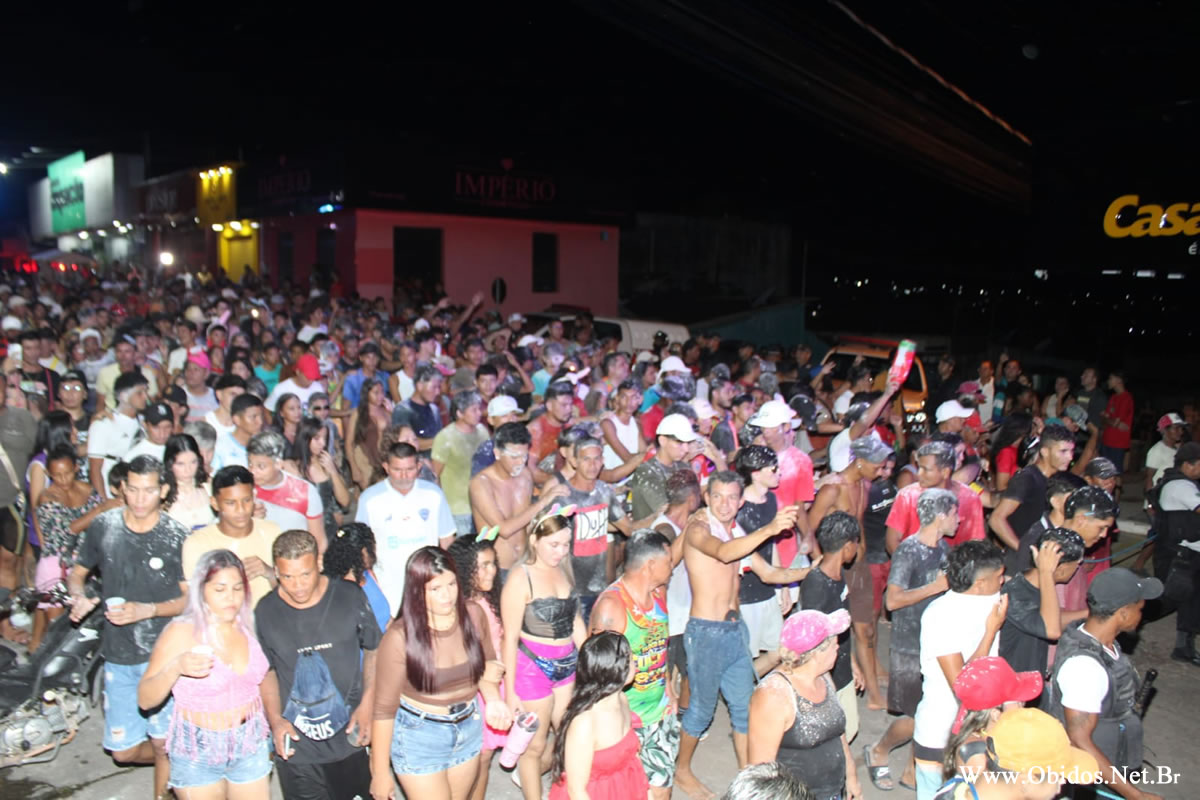 Na tradicional subida da Ladeira do Mercado, toda ornamentada para a ocasião, a chuva se intensificou. Ainda assim, os foliões encararam a ladeira com animação e alegria, sendo saudados por uma salva de fogos que iluminou o céu de Óbidos, em homenagem a um dos blocos mais populares e divertidos do Carnapauxis.