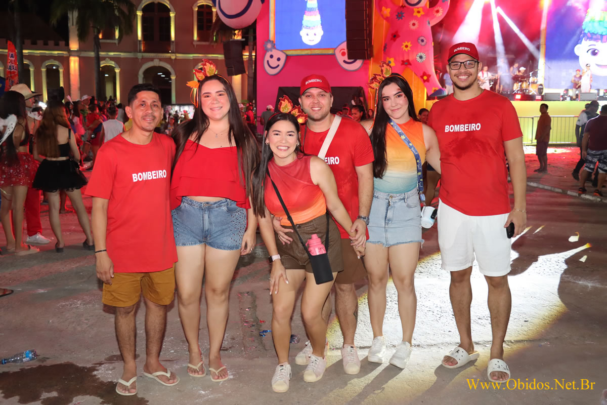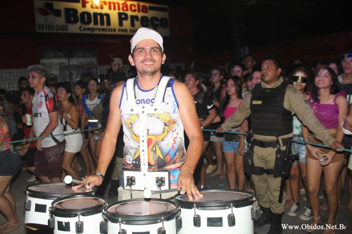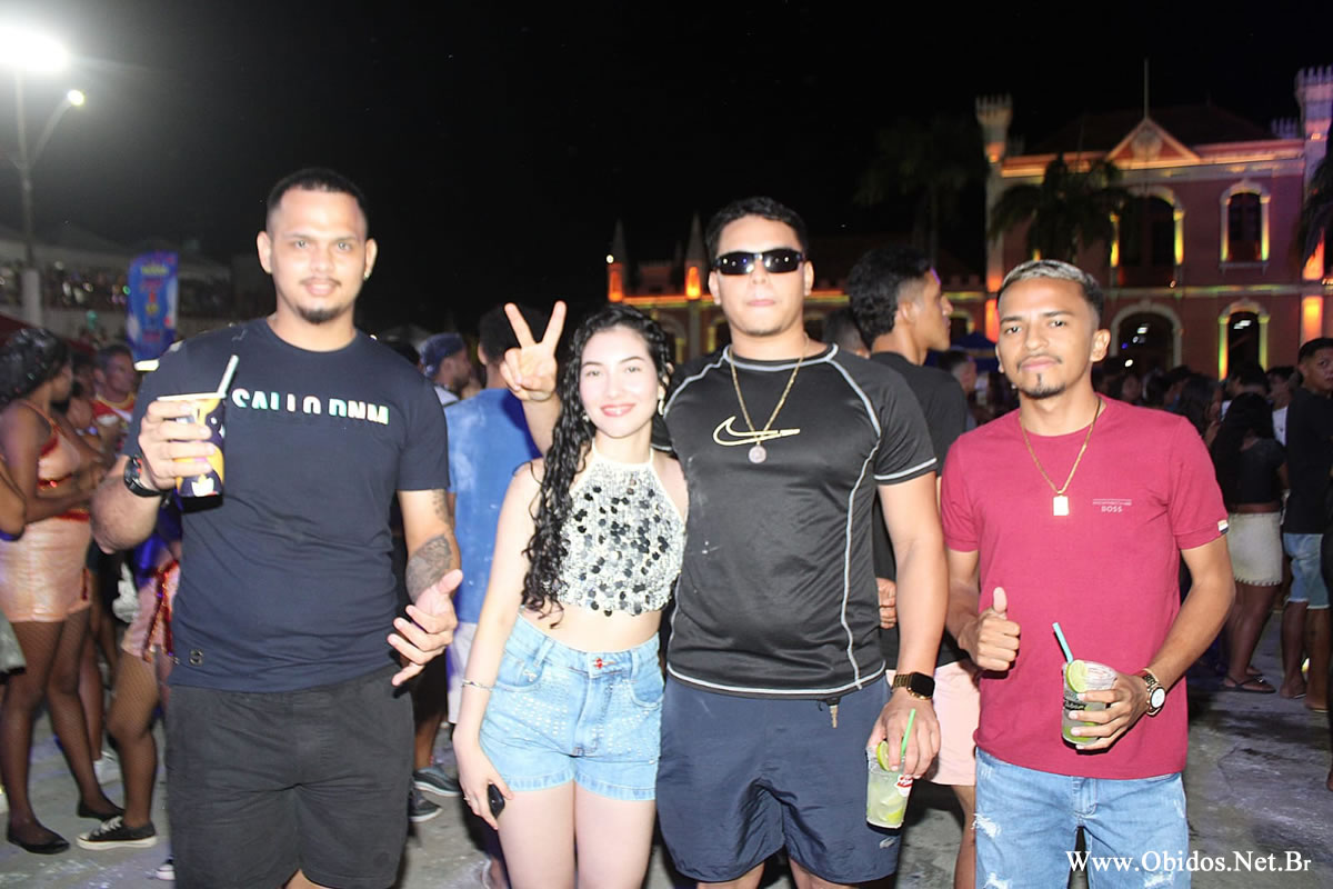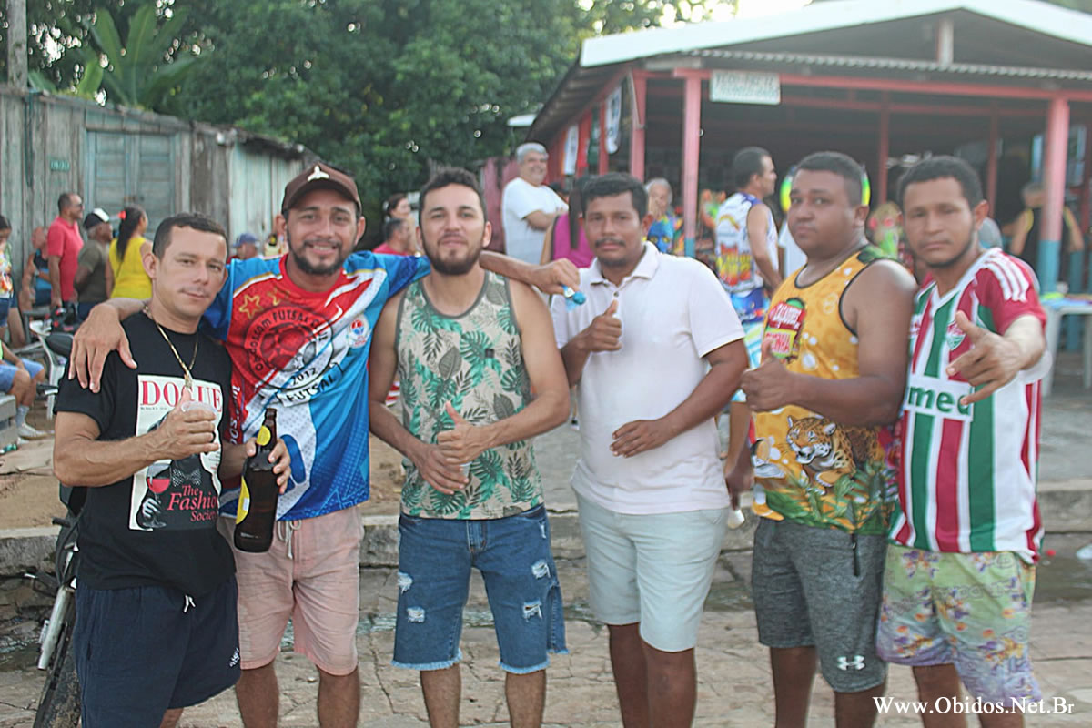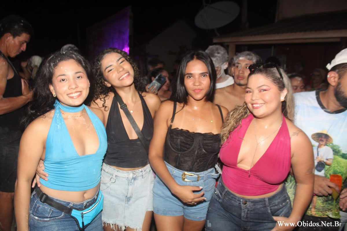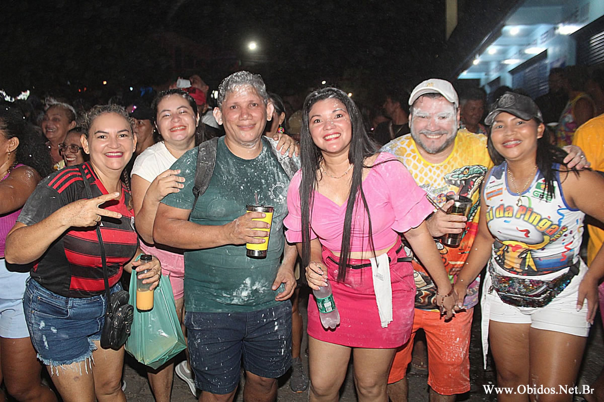 Na tradicional subida da Ladeira do Mercado, toda ornamentada para a ocasião, a chuva se intensificou. Ainda assim, os foliões encararam a ladeira com animação e alegria, sendo saudados por uma salva de fogos que iluminou o céu de Óbidos, em homenagem a um dos blocos mais populares e divertidos do Carnapauxis.