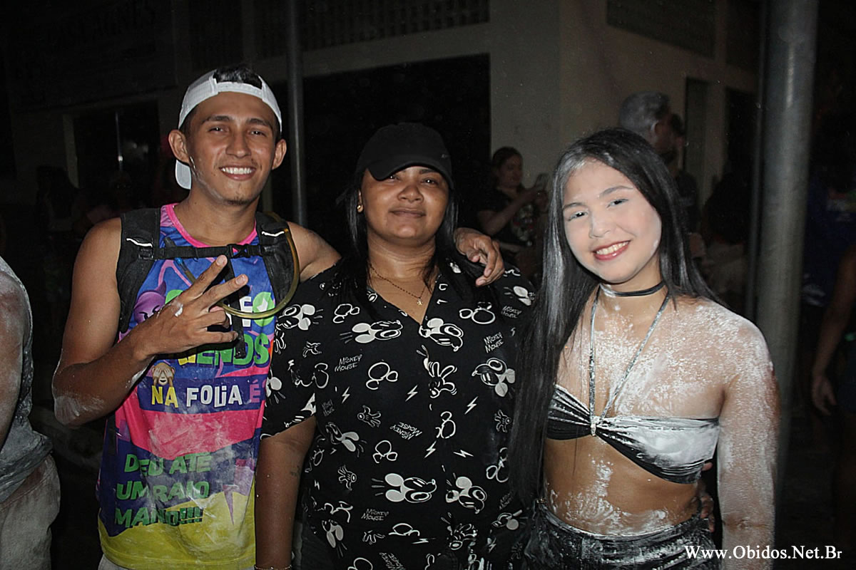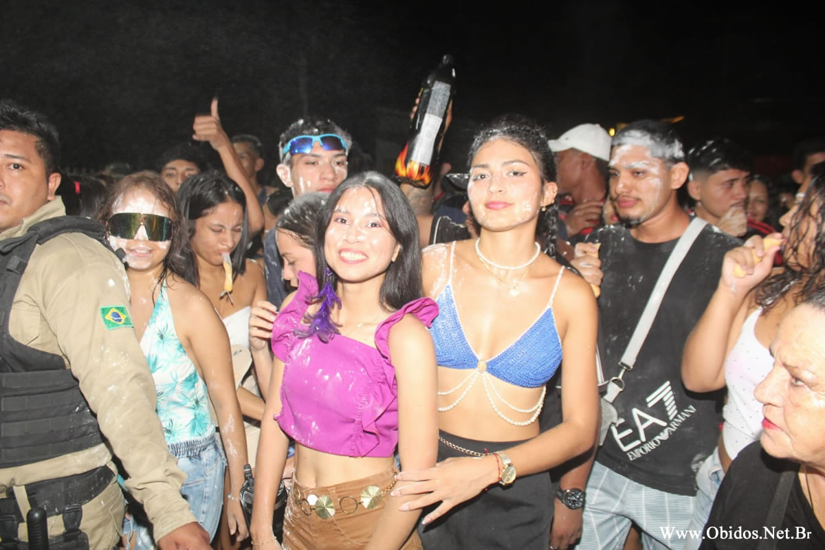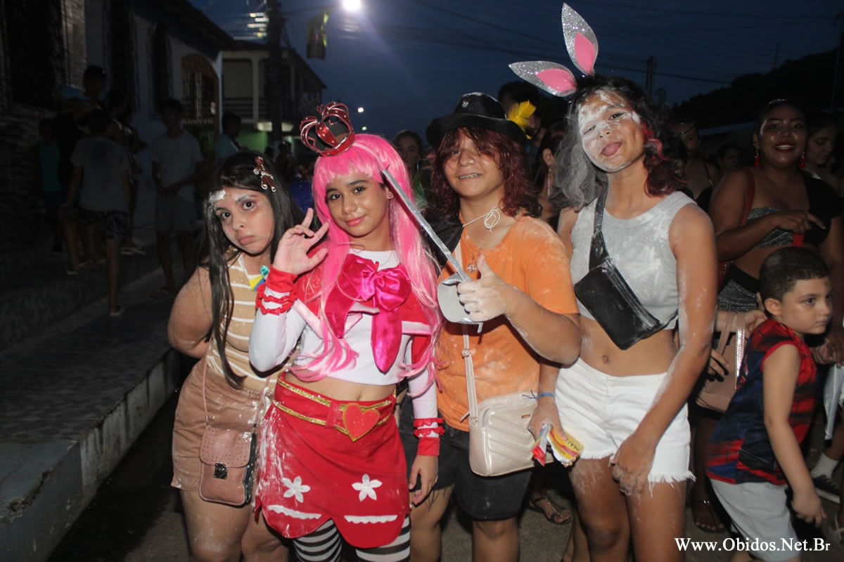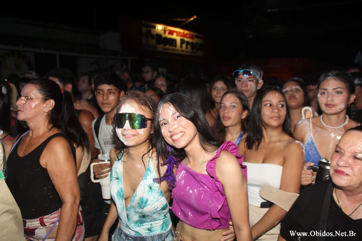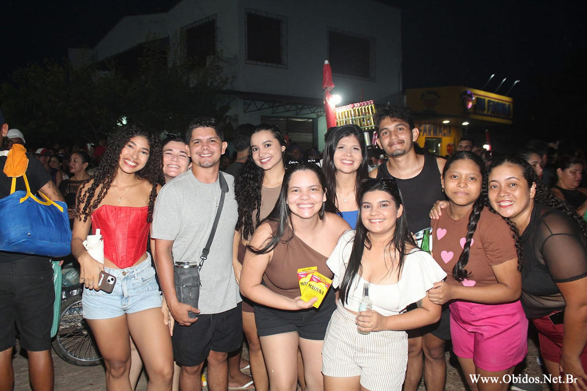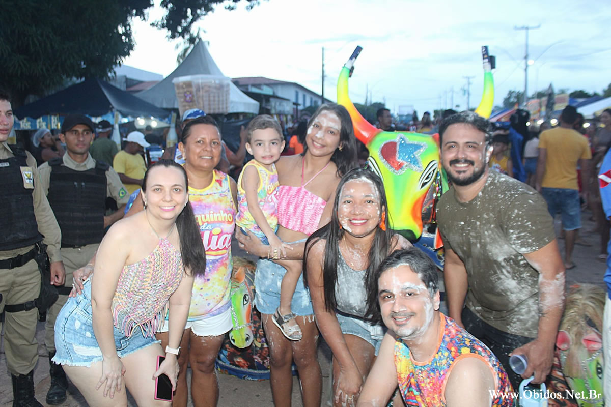 Na tradicional subida da Ladeira do Mercado, toda ornamentada para a ocasião, a chuva se intensificou. Ainda assim, os foliões encararam a ladeira com animação e alegria, sendo saudados por uma salva de fogos que iluminou o céu de Óbidos, em homenagem a um dos blocos mais populares e divertidos do Carnapauxis.