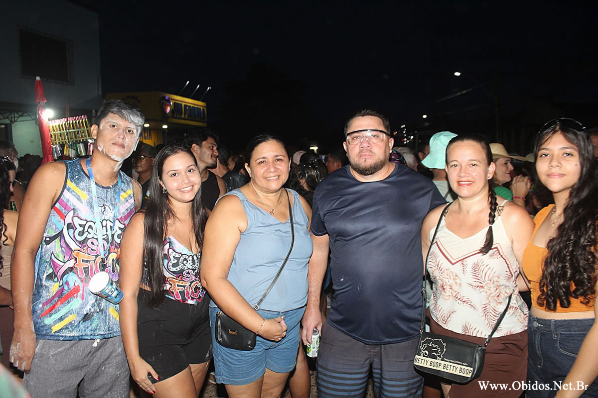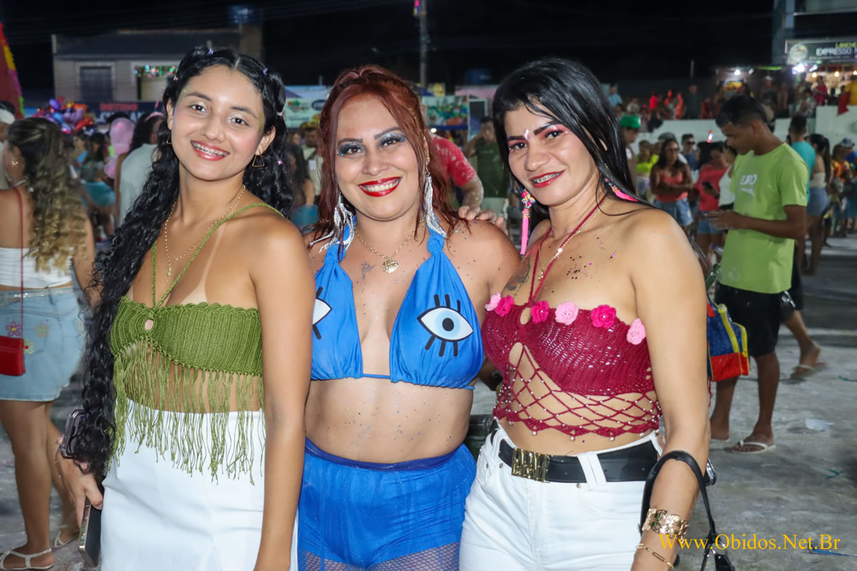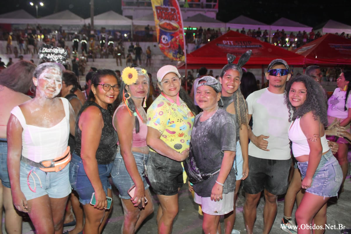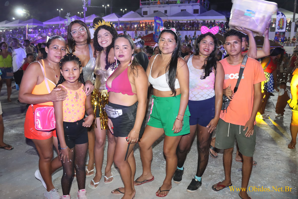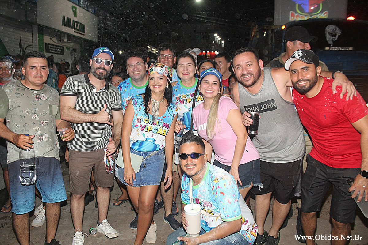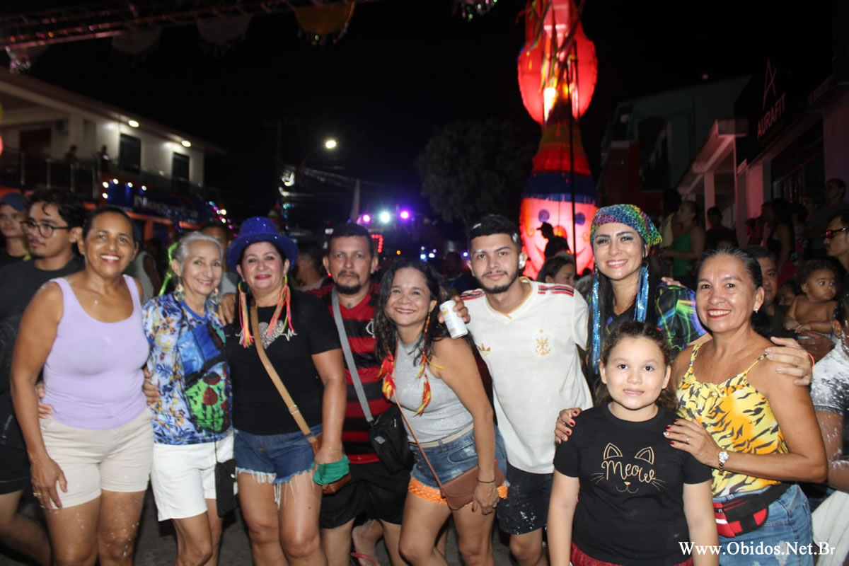 Na tradicional subida da Ladeira do Mercado, toda ornamentada para a ocasião, a chuva se intensificou. Ainda assim, os foliões encararam a ladeira com animação e alegria, sendo saudados por uma salva de fogos que iluminou o céu de Óbidos, em homenagem a um dos blocos mais populares e divertidos do Carnapauxis.