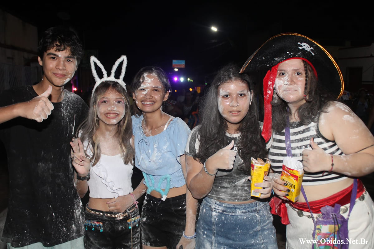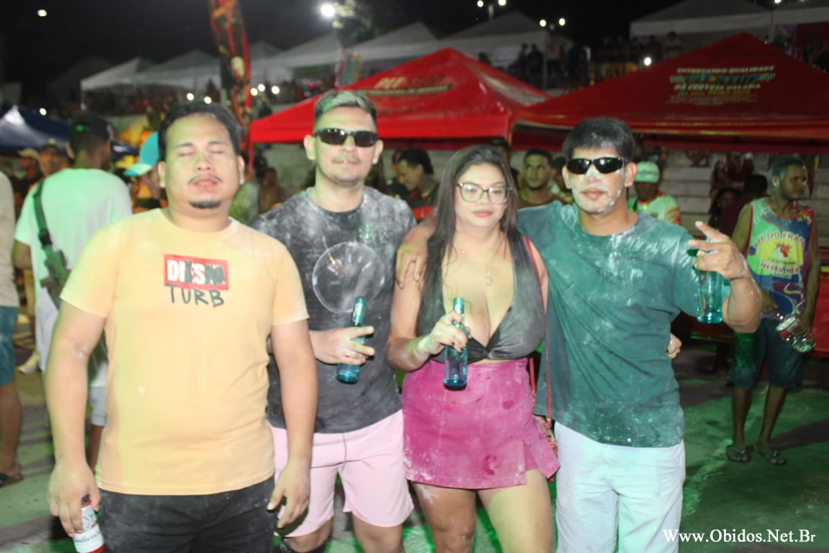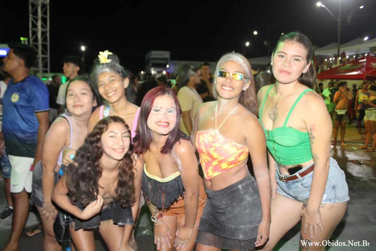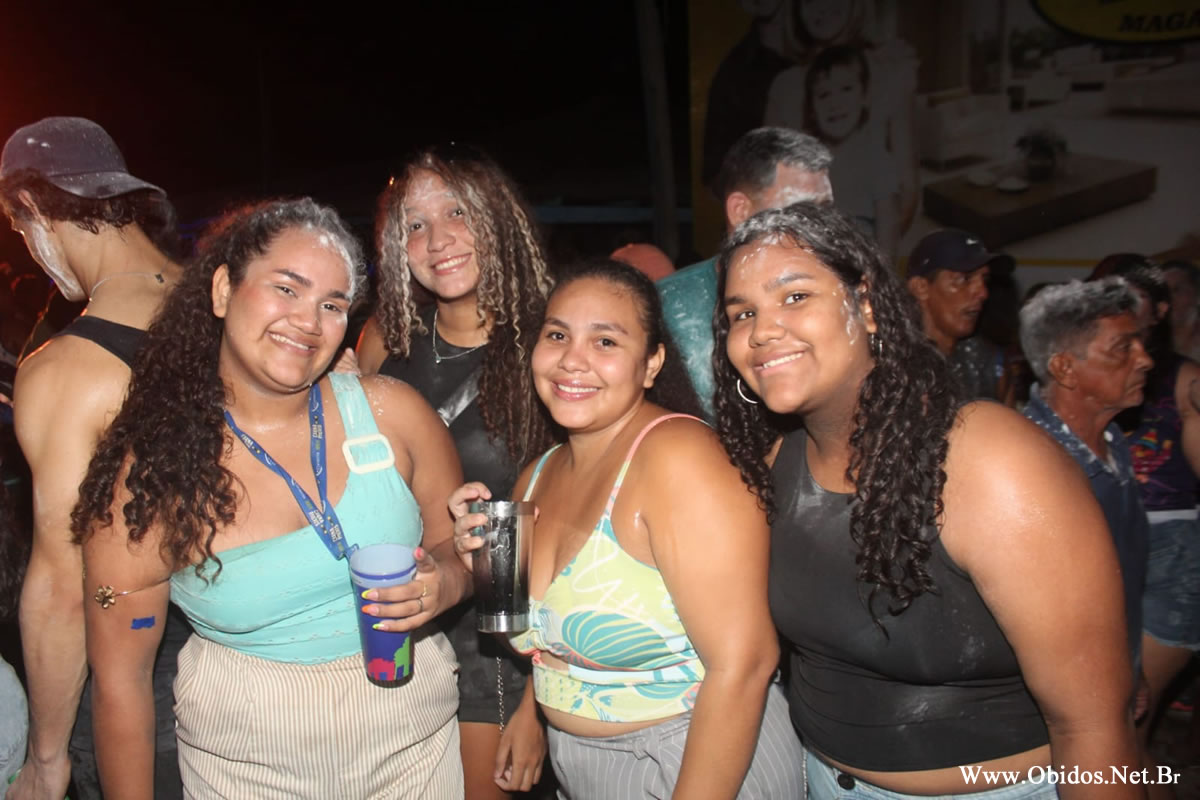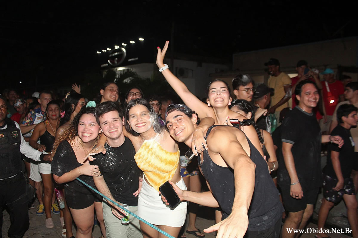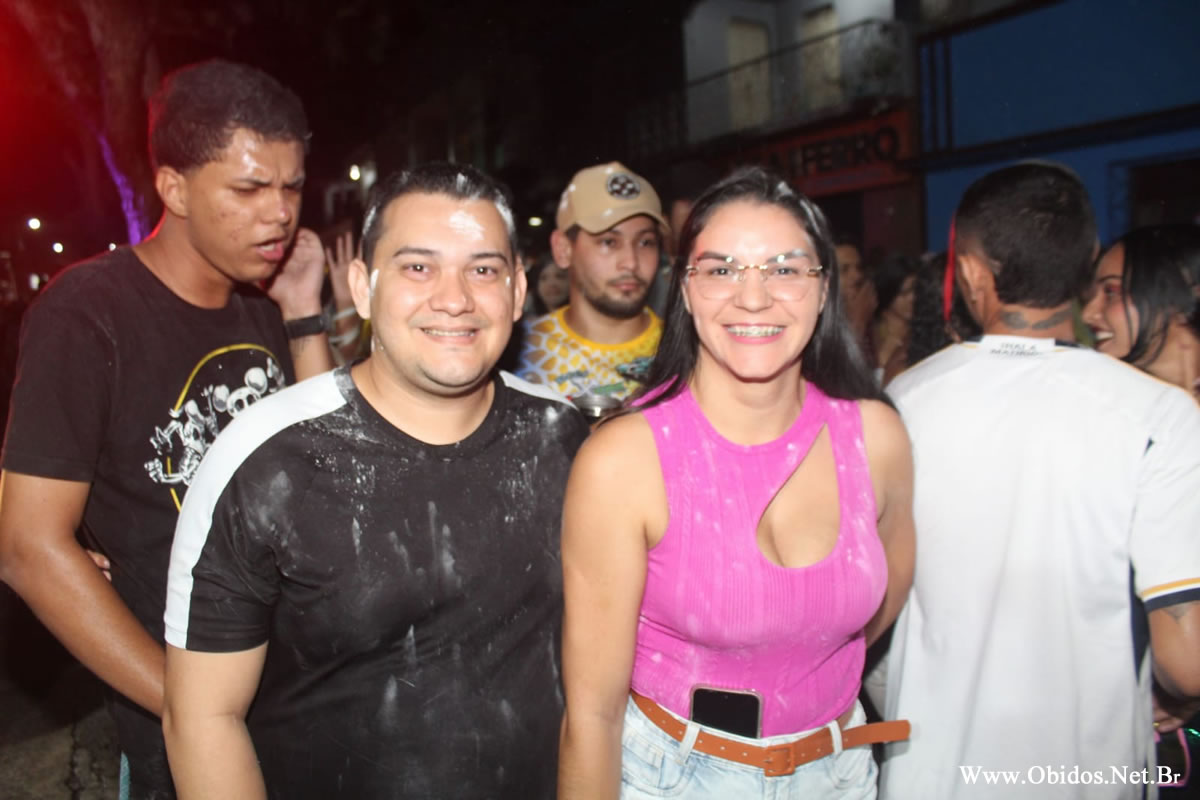 Na tradicional subida da Ladeira do Mercado, toda ornamentada para a ocasião, a chuva se intensificou. Ainda assim, os foliões encararam a ladeira com animação e alegria, sendo saudados por uma salva de fogos que iluminou o céu de Óbidos, em homenagem a um dos blocos mais populares e divertidos do Carnapauxis.