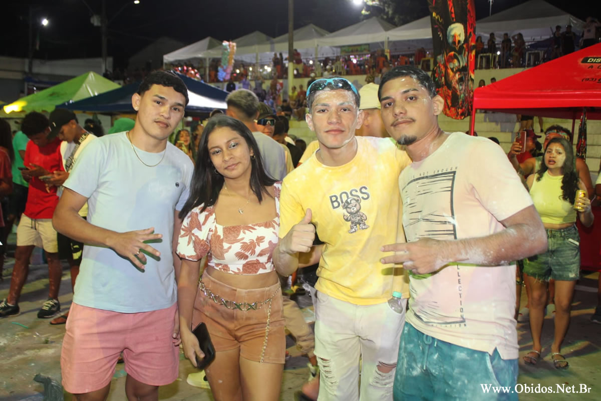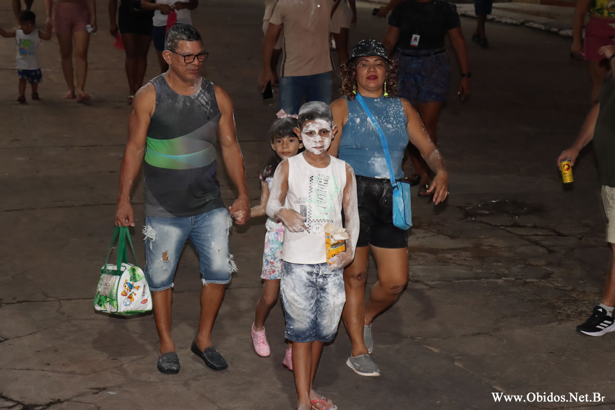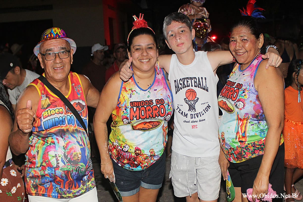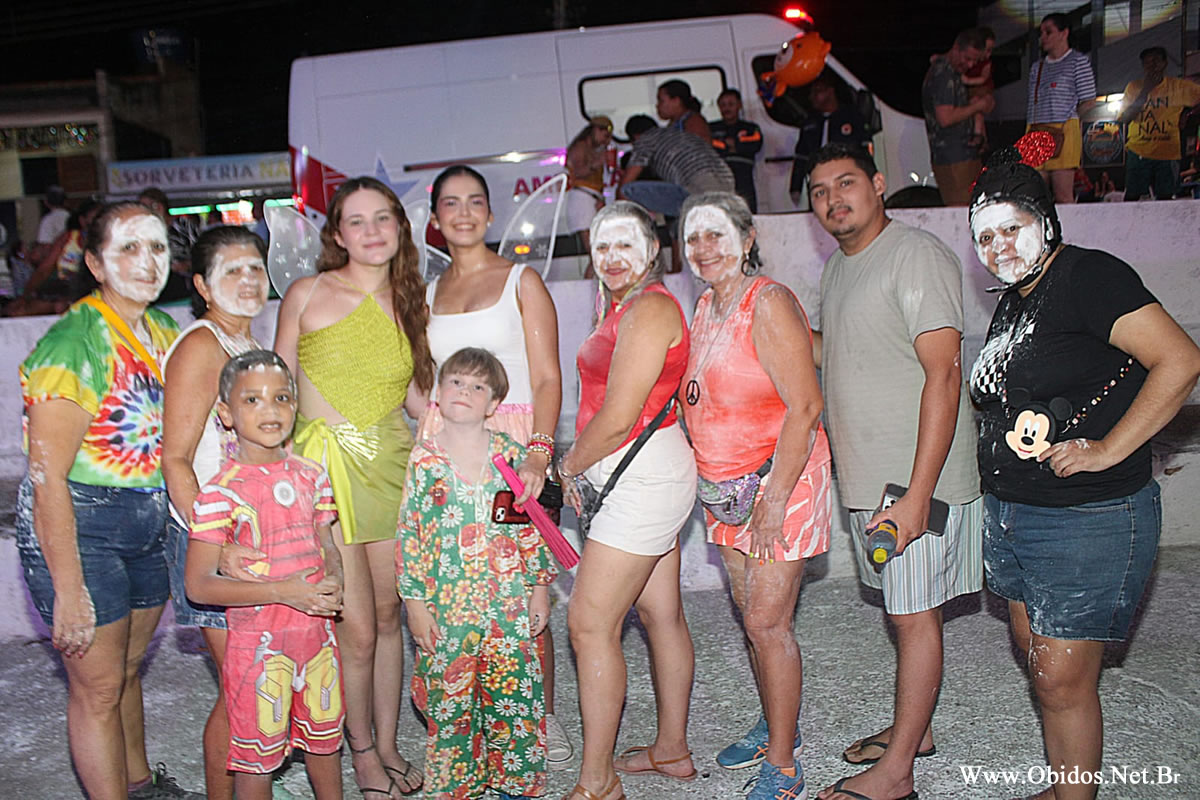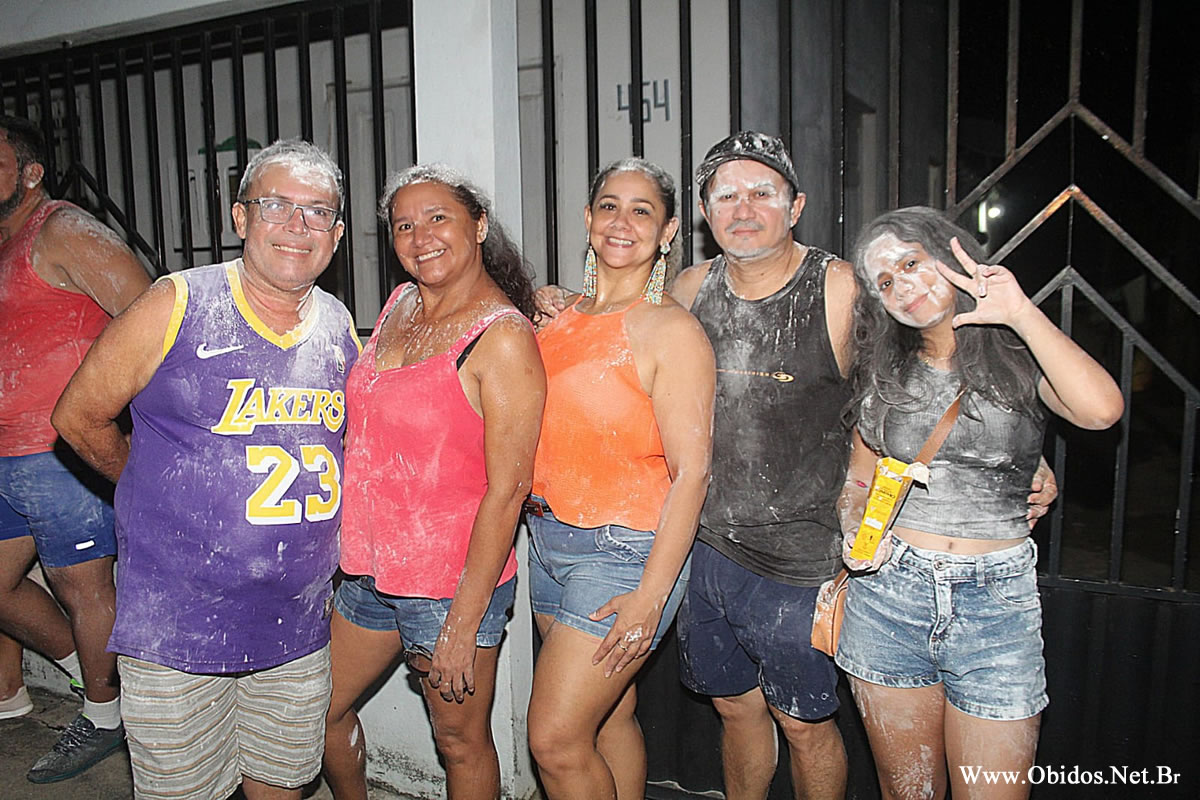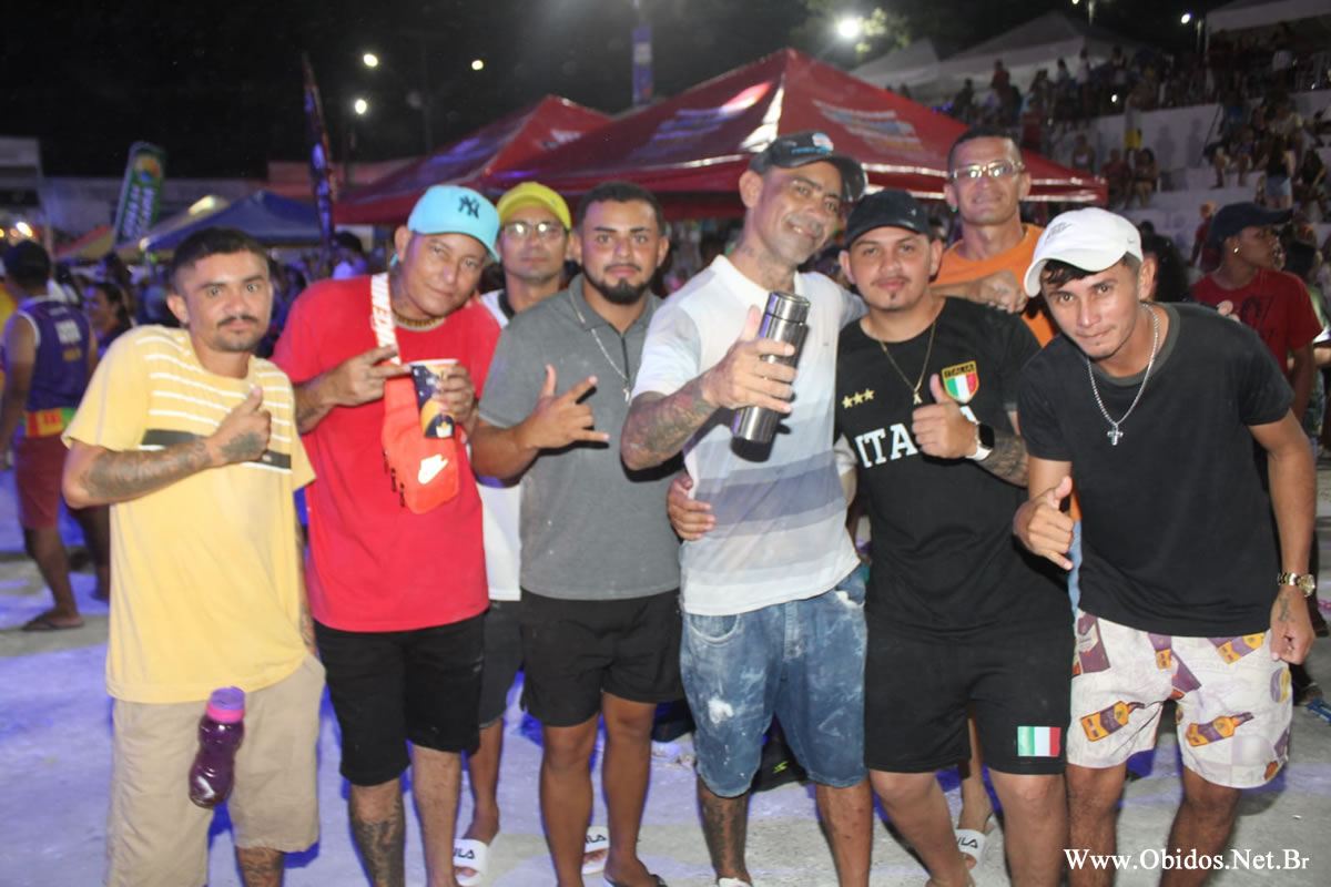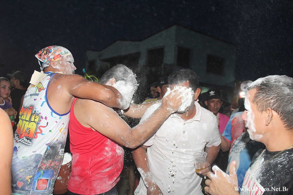 Na tradicional subida da Ladeira do Mercado, toda ornamentada para a ocasião, a chuva se intensificou. Ainda assim, os foliões encararam a ladeira com animação e alegria, sendo saudados por uma salva de fogos que iluminou o céu de Óbidos, em homenagem a um dos blocos mais populares e divertidos do Carnapauxis.
