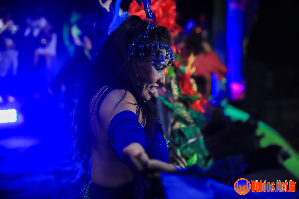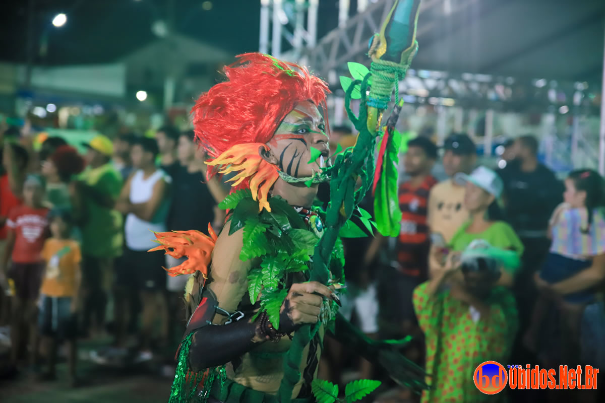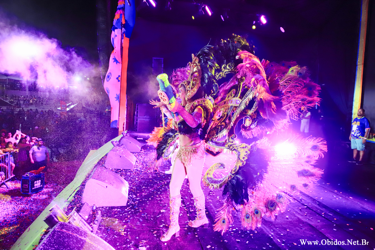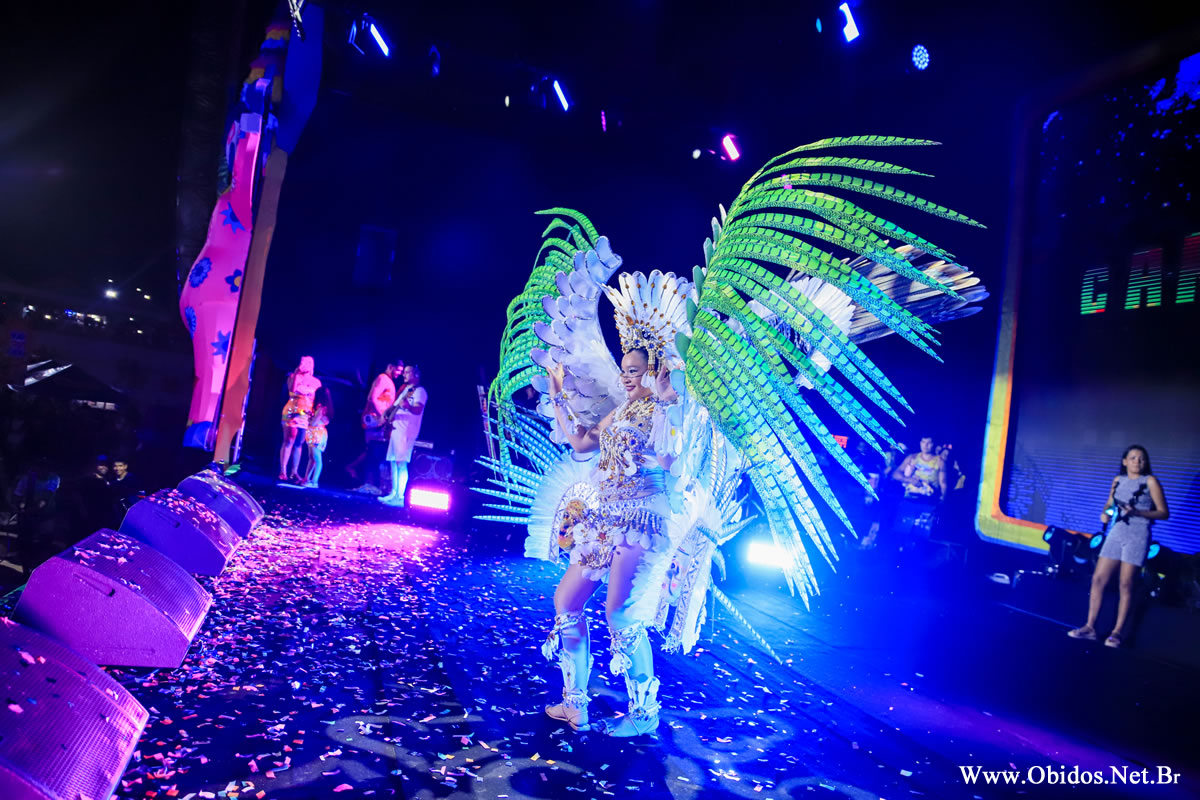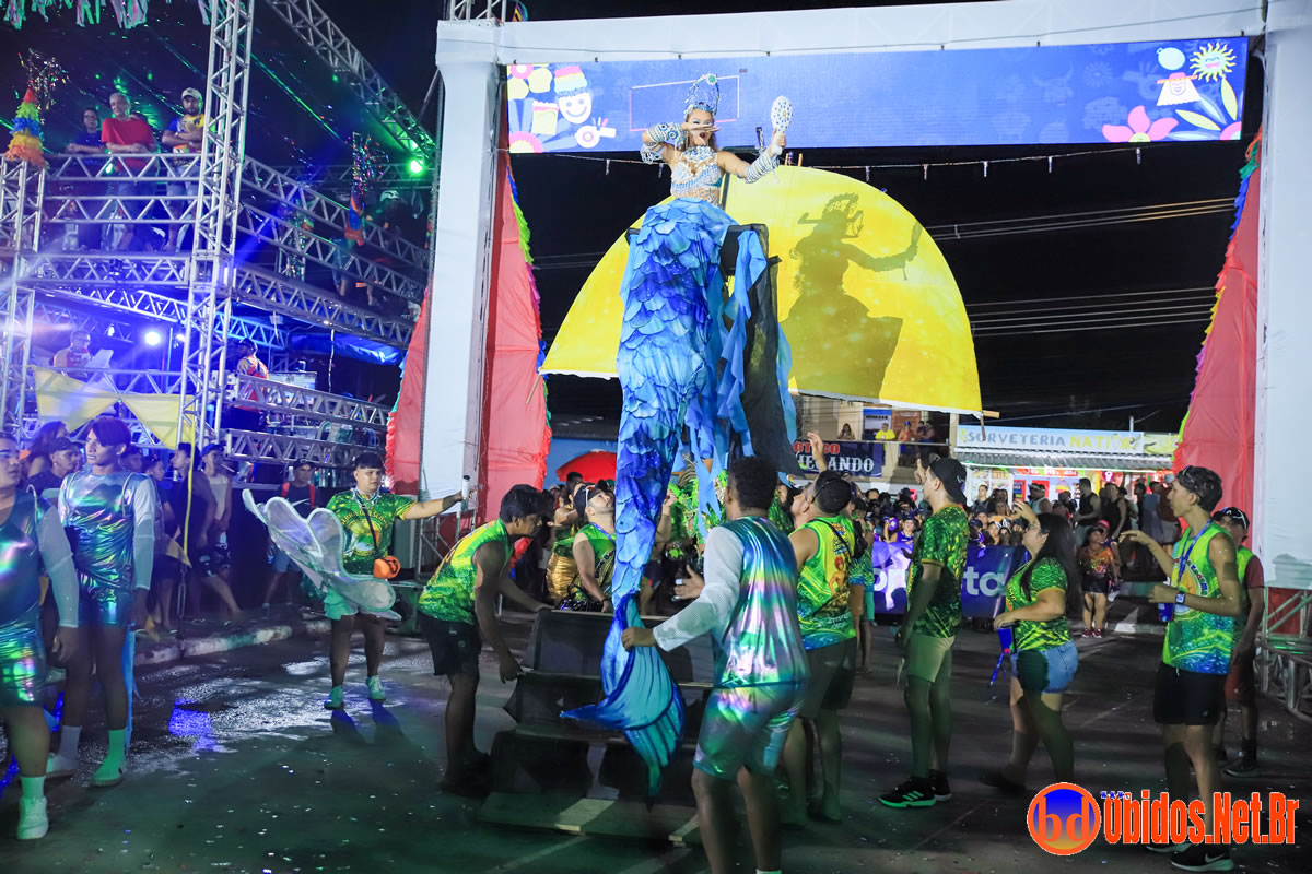 Outro grande destaque foi a Rainha do Bloco, Luiza Pinto, que representou “Os Encantados dos Rios – Yara Mãe D’Água”. Sob a luz da lua, a entidade mística do Lago Pauxis surgiu para encantar, proteger as águas e simbolizar a beleza e a magia da Serra da Escama.