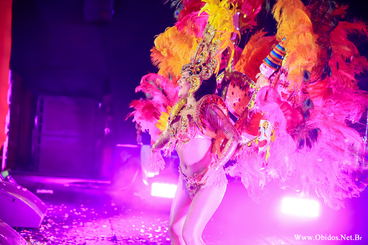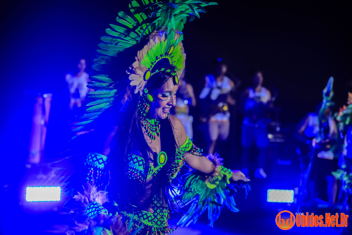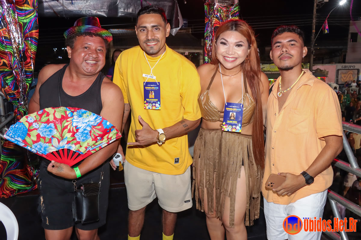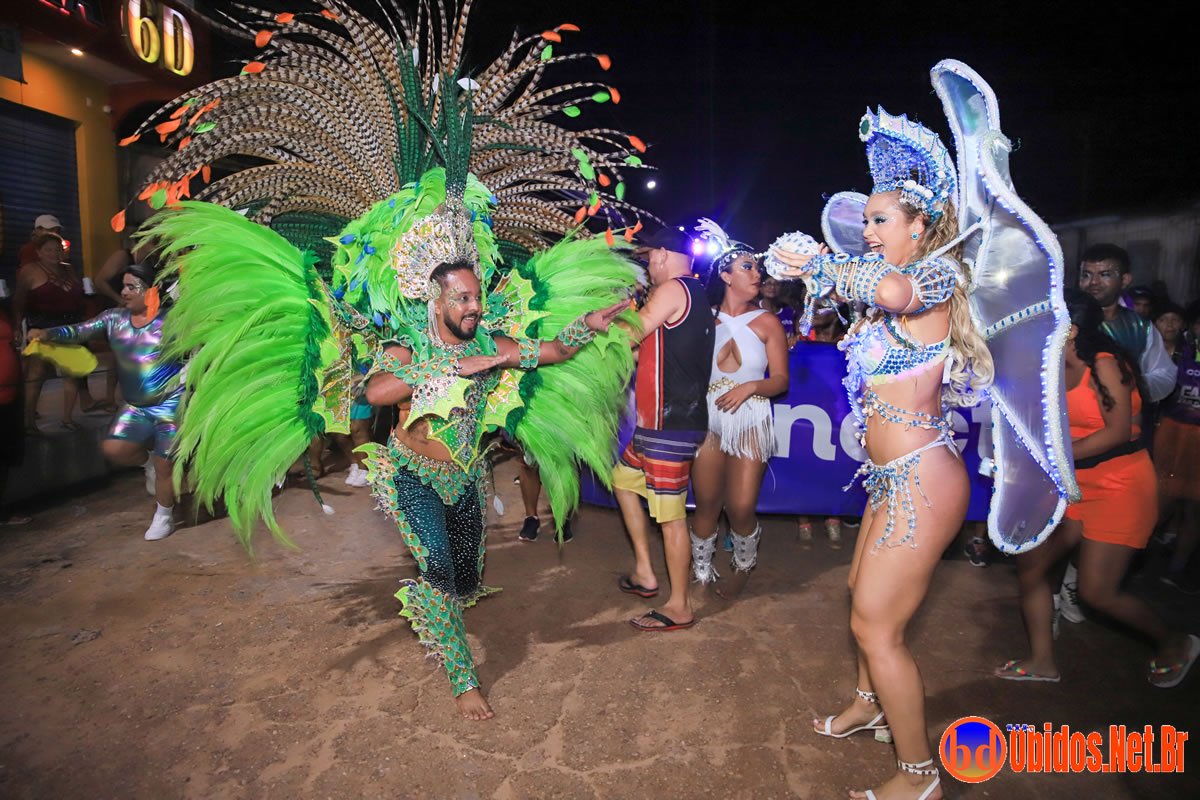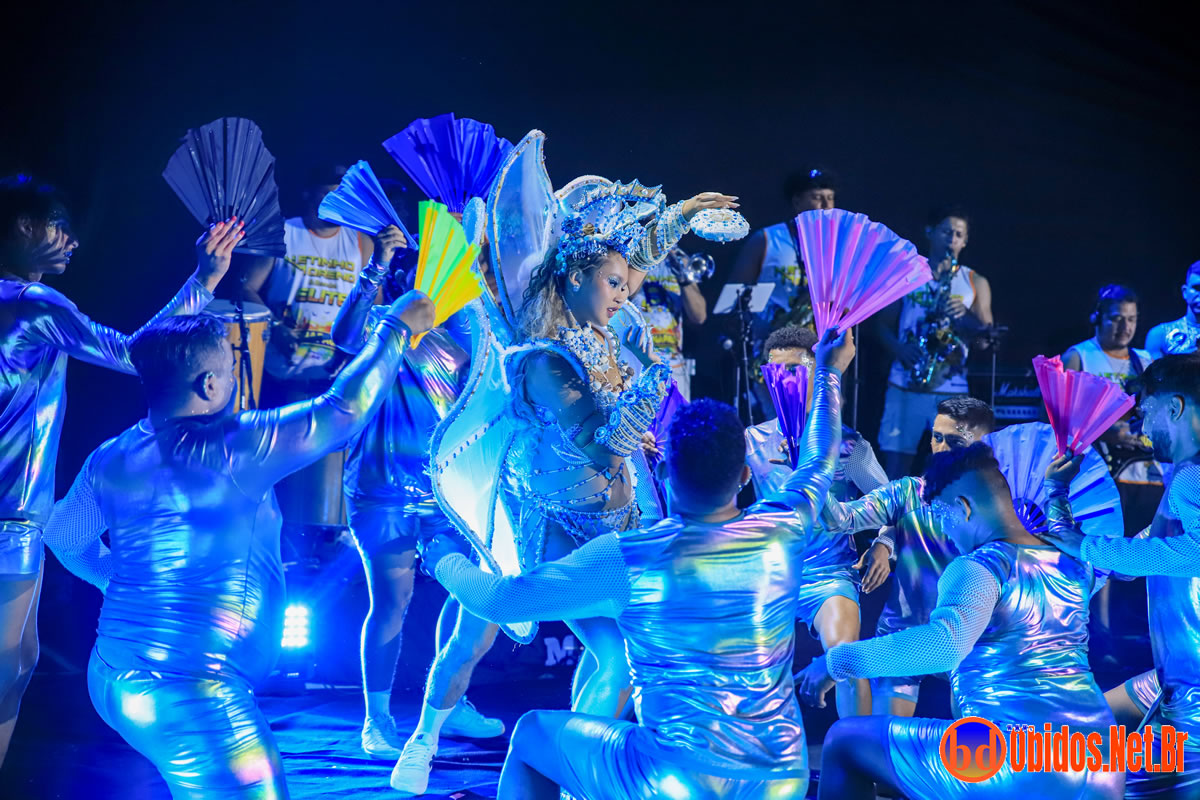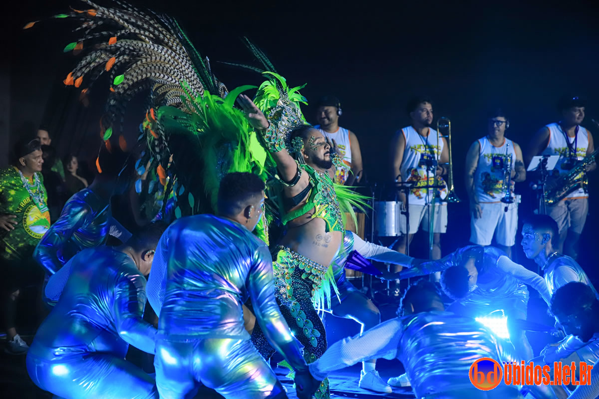 Outro grande destaque foi a Rainha do Bloco, Luiza Pinto, que representou “Os Encantados dos Rios – Yara Mãe D’Água”. Sob a luz da lua, a entidade mística do Lago Pauxis surgiu para encantar, proteger as águas e simbolizar a beleza e a magia da Serra da Escama.
