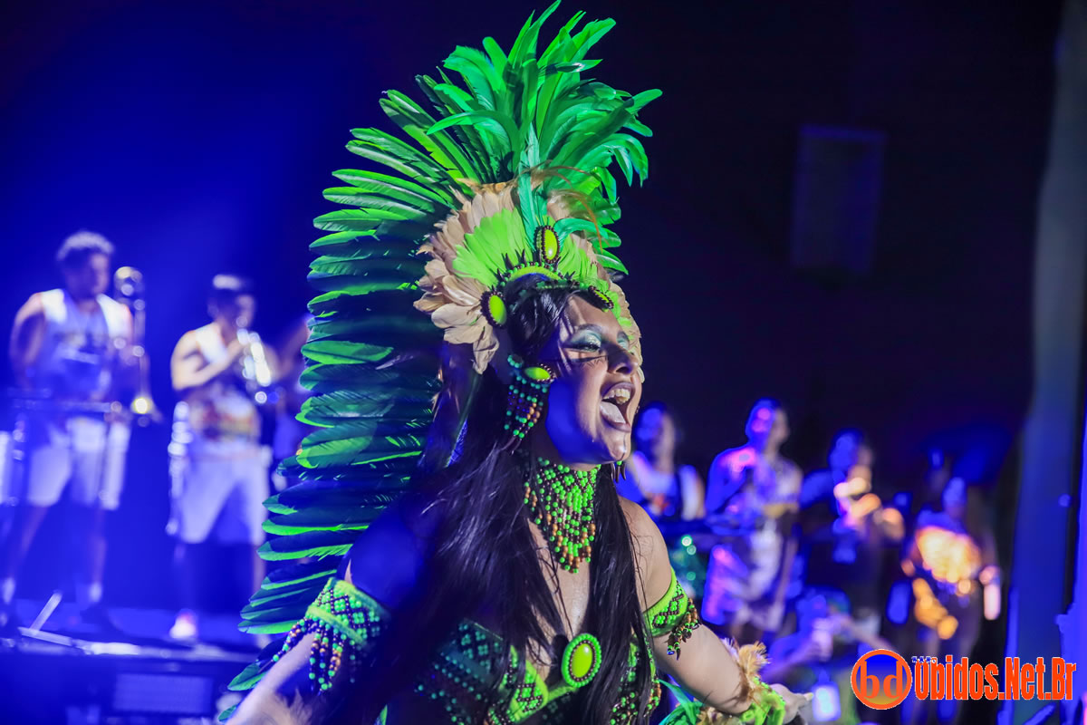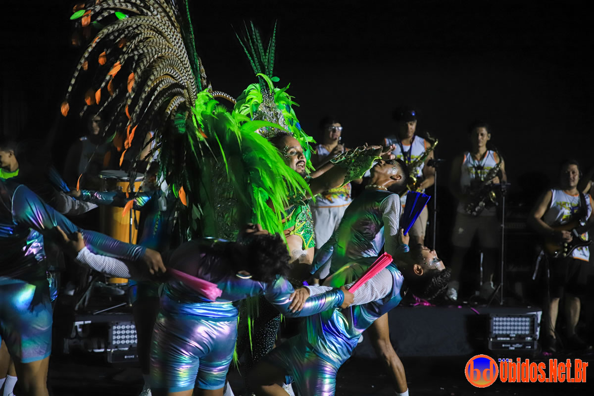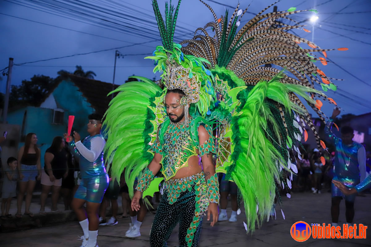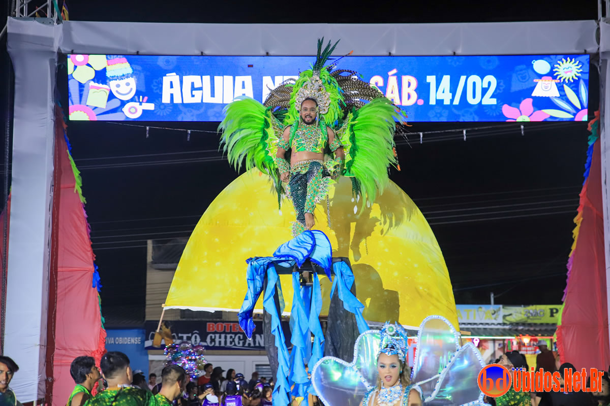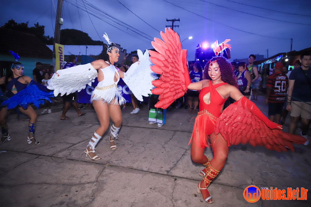 Outro grande destaque foi a Rainha do Bloco, Luiza Pinto, que representou “Os Encantados dos Rios – Yara Mãe D’Água”. Sob a luz da lua, a entidade mística do Lago Pauxis surgiu para encantar, proteger as águas e simbolizar a beleza e a magia da Serra da Escama.