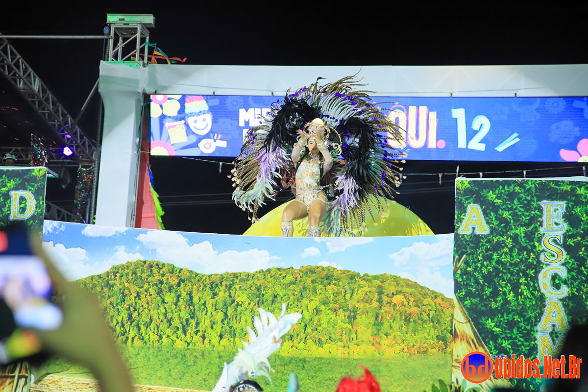 A Porta-Estandarte Ana Beatriz Tavares encantou o público com o tema “A Luz da Lua que Ilumina a Serra da Escama”. Sob o brilho lunar, o imaginário amazônico ganhou vida, espalhando lendas e mitos, enquanto a serra se vestia de cores, alegria e mascarados.