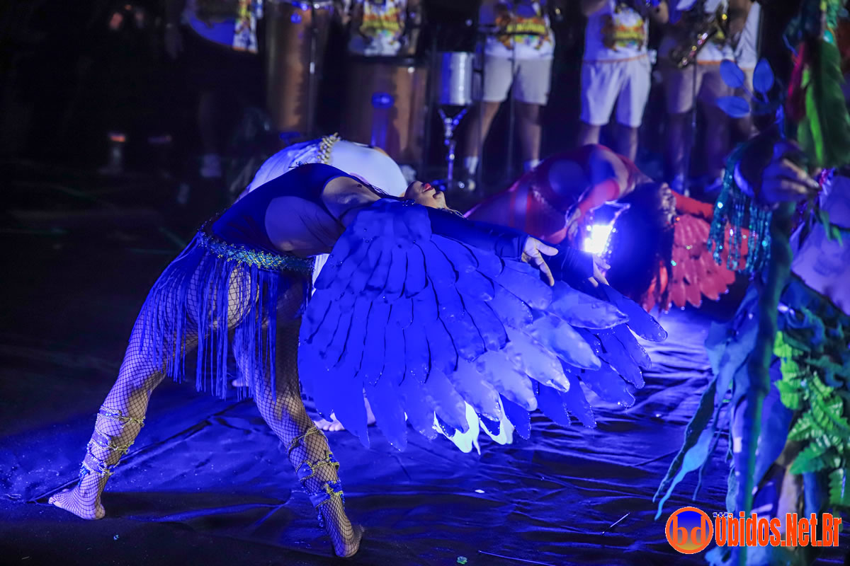 O desfile também contou com as representações de Lorena Cardoso, como a Cunhã Guardiã Pauxi, e Anilton Cerdeira, como o Curupira Guardião Encantado. Juntos, realizaram um ritual indígena que reverenciou a natureza como ser vivo e sagrado, fonte de toda a vida.