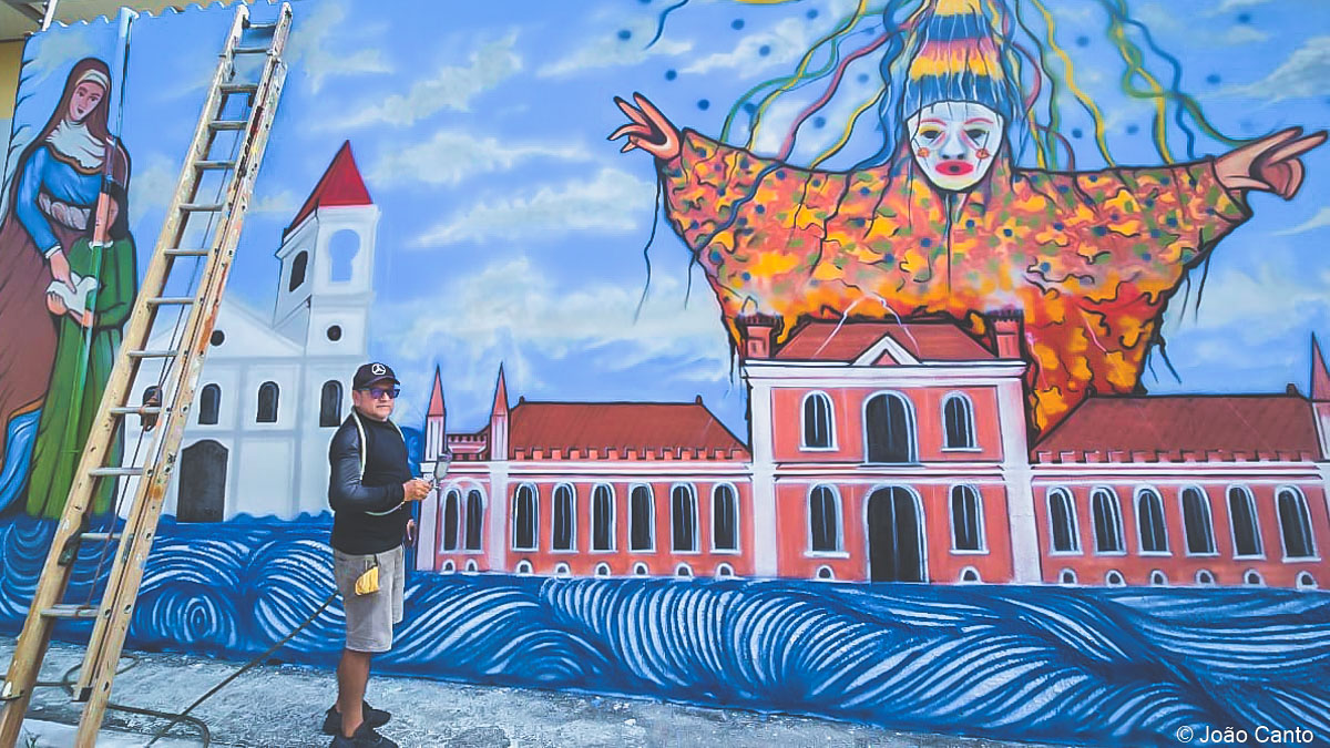 Quem passou recentemente pela Rua Marcos R de Souza, próximo a Fórum, em Óbidos teve a oportunidade de presenciar a arte ganhando forma e significado. O artista plástico obidense Albino Júnior estava transformando uma parede em uma verdadeira obra de arte, retratando três grandes símbolos da identidade cultural e religiosa do município: o Mascarado Fobó, ícone do tradicional Carnaval de Óbidos – o Carnapauxis –, a Igreja de Sant’Ana, referência da fé católica da cidade, e o Quartel, outro símbolo da cultura obidense.