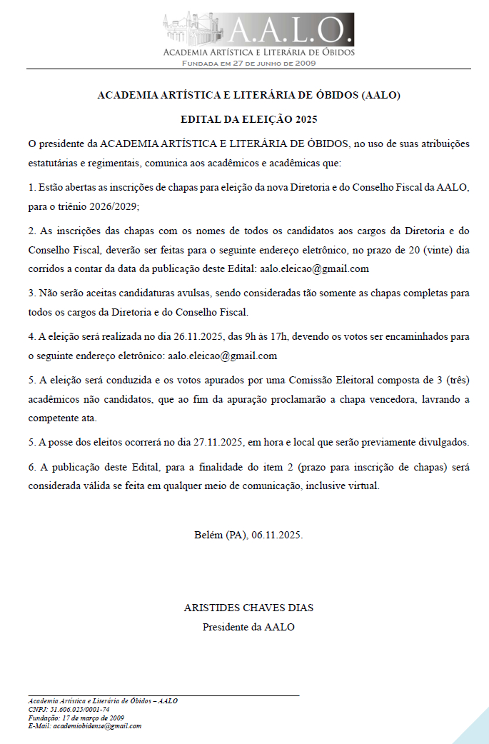 A Academia Artística e Literária de Óbidos (AALO) publicou nesta quinta-feira, 5 de novembro de 2025, o edital que convoca seus acadêmicos para a eleição da nova Diretoria e do Conselho Fiscal, que atuarão no triênio 2026-2029.