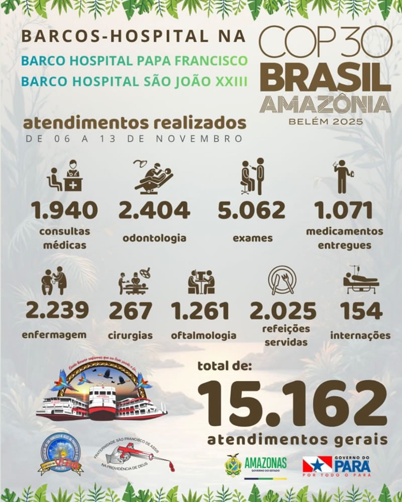 Os Barcos Hospitais Papa Francisco e Papa São João XXIII concluíram, no dia 13 de novembro, a expedição realizada durante a COP30, em Belém, levando assistência humanitária e serviços de saúde a milhares de pessoas. A iniciativa, realizada entre os dias 6 e 13, foi resultado da parceria entre o Governo do Pará, o Governo do Amazonas e a Associação e Fraternidade São Francisco de Assis na Providência de Deus, responsável pela gestão das embarcações.