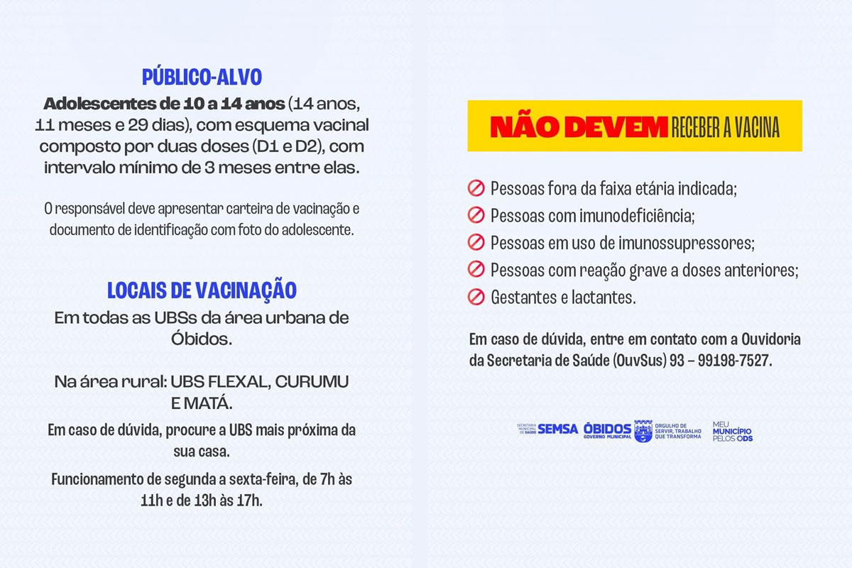 A Secretaria Municipal de Saúde (SEMSA) de Óbidos, no Pará, anunciou a disponibilidade da vacinação contra a dengue para o público-alvo de 10 a 14 anos, no município. A campanha faz parte das ações de prevenção e controle da doença transmitida pelo mosquito Aedes aegypti, em um contexto de alerta contínuo para arboviroses na região amazônica.