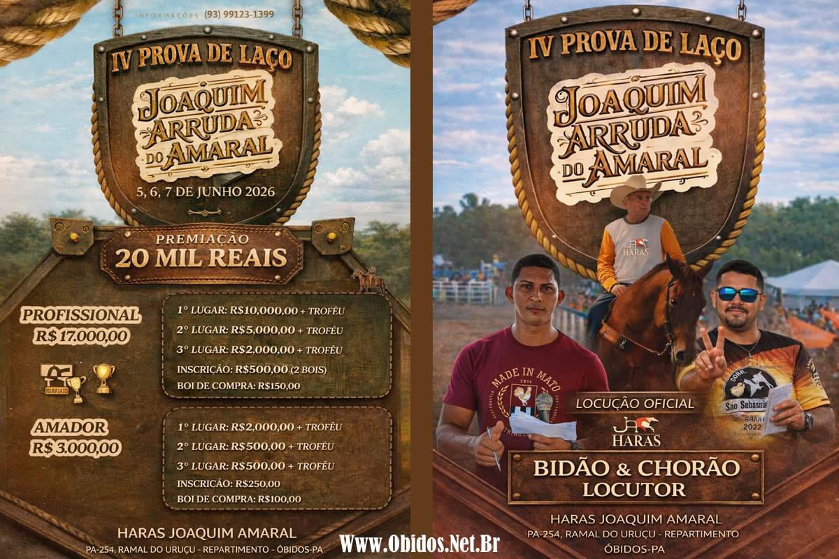 A cidade de Óbidos se prepara para sediar um dos eventos mais aguardados do calendário rural: a IV Prova de Laço Joaquim Arruda do Amaral, que acontecerá nos dias 5, 6 e 7 de junho de 2026, no Haras Joaquim Amaral, localizado na PA-254, Ramal do Uruçu, região do Repartimento.