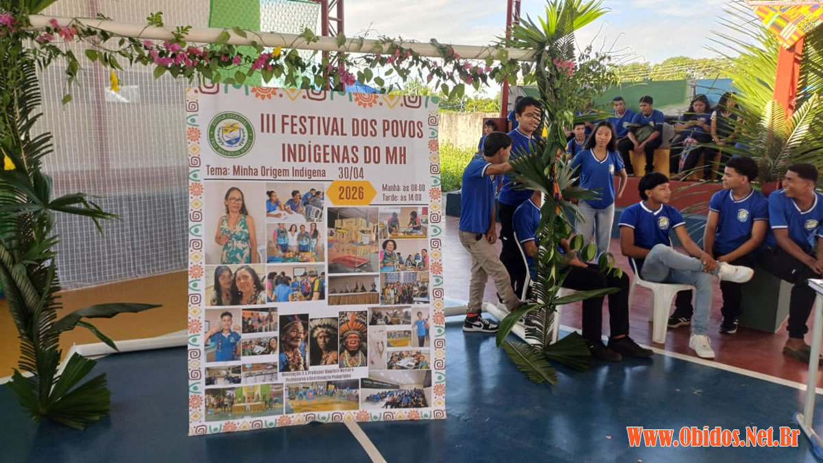 A Escola Estadual Prof. Maurício Hamoy promoveu, nesta quinta-feira, dia 30 de abril de 2026, o III Festival dos Povos Indígenas do MH, em Óbidos. Com o tema “Minha origem indígena”, o evento buscou valorizar a cultura, a identidade e os saberes dos povos originários, envolvendo estudantes, professores e a comunidade escolar.
