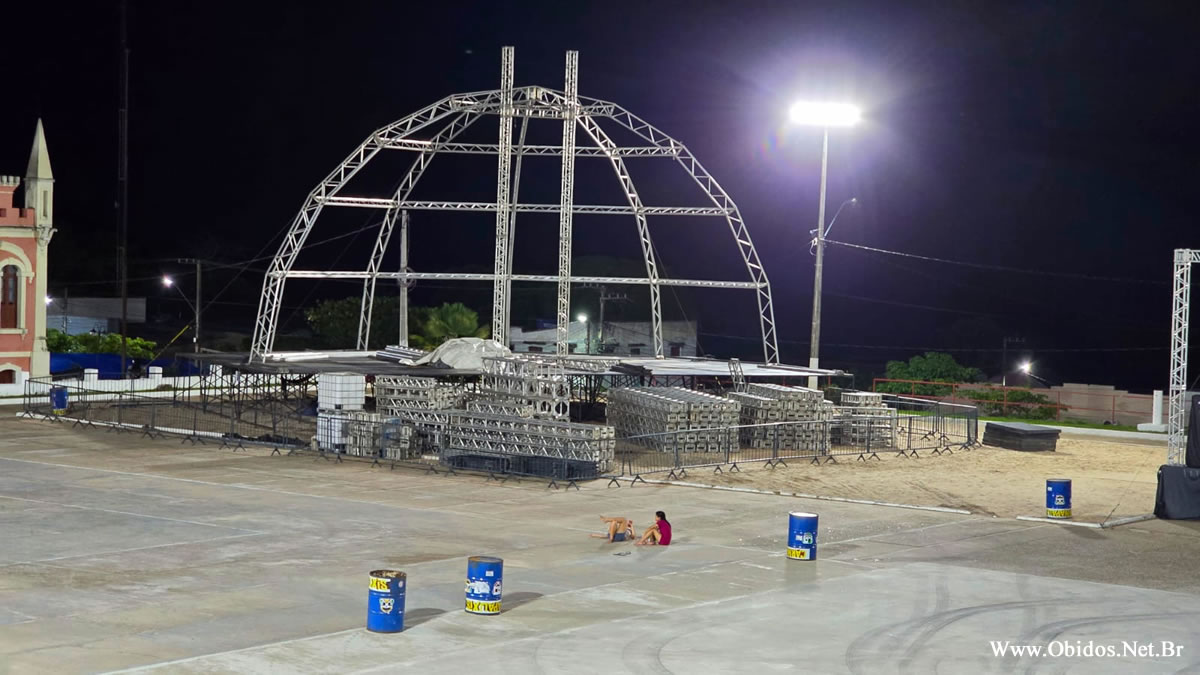 A Praça da Cultura, localizada no Centro Histórico de Óbidos, já começa a ganhar nova configuração para receber o público. Conforme mostram as fotografias registradas nesta quinta-feira, dia 22, as estruturas de palco já estão sendo erguidas. Em breve, será a vez dos camarotes ganharem forma, completando o espaço destinado às apresentações e concentrações dos blocos.